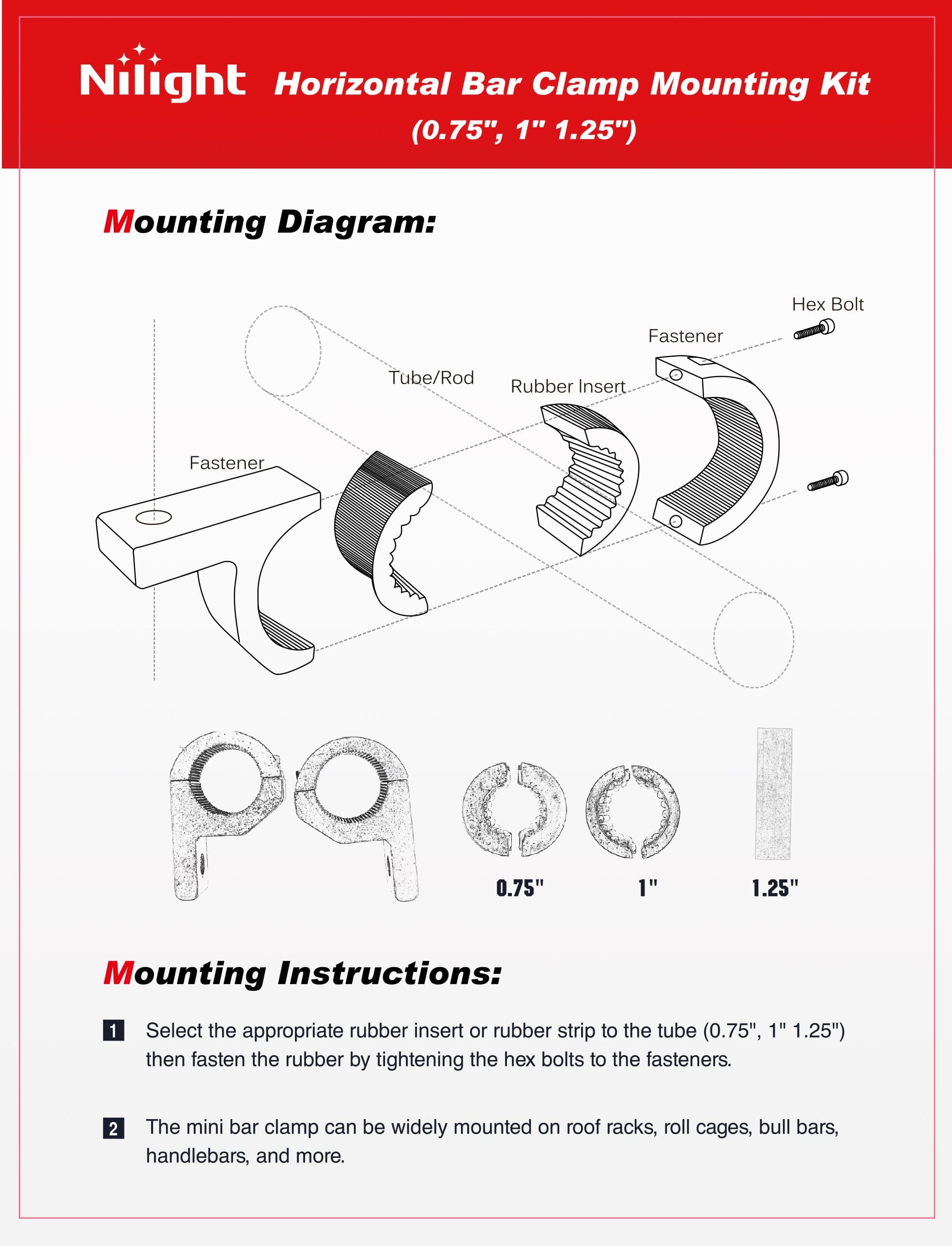 - Make Light Mounting Easier With the high compatible bar clamp you’ll hassle, free of drilling holes in your vehicle body. A simple all-in-one kit makes your life easier.