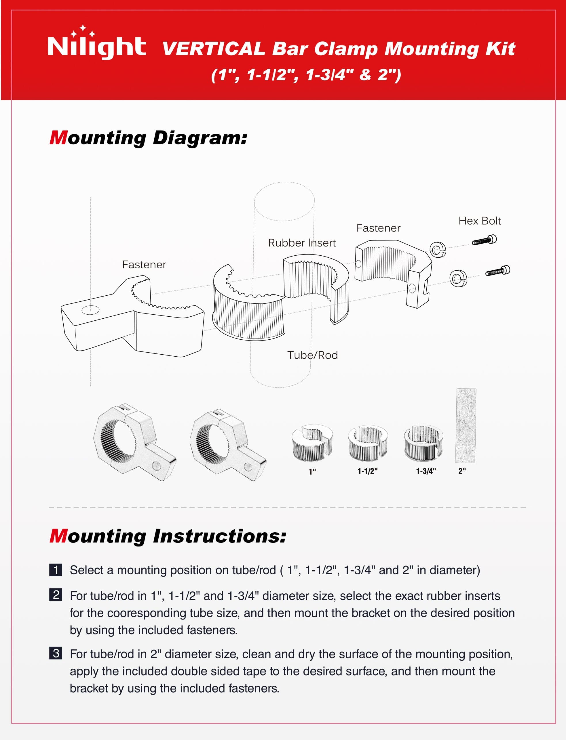 Simplifies the installation of Nilight off-road LED light bars onto your roof rack, bull bar, or head rack. Material: Aluminum alloy and rubber. The kit can be used for tubes sized at 1in, 1-1/2in, 1-3/4in & 2in in diameter. Fits all light bars with 10mm mounting screws.