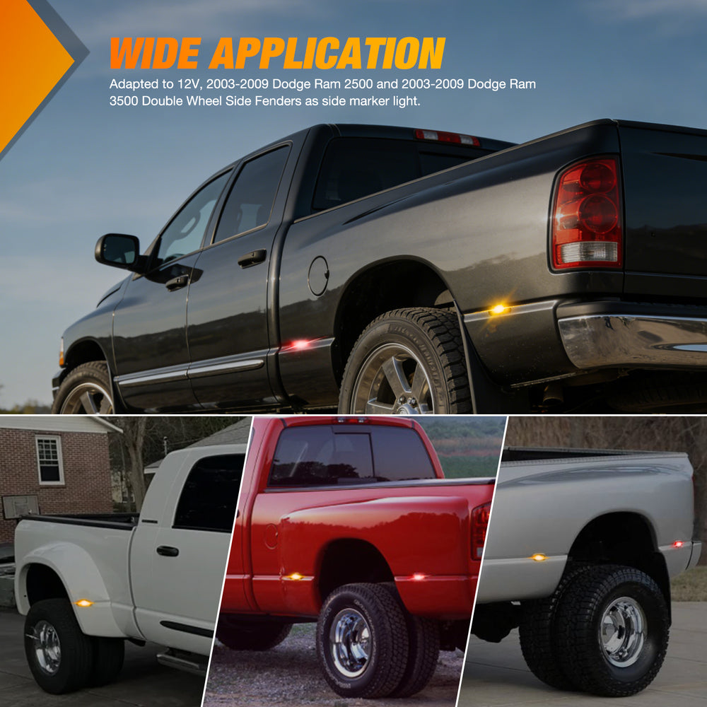 • Perfect Fit: Used as LED wheel fender marker light, compatible with 12V DC 2003 2004 2005 2006 2007 2008 2009 Dodge Ram 1500 2500 3500 Super Duty Dully vehicles only. Also DIY as front side rear marker light clearance light for truck, trailer, bus, boat etc