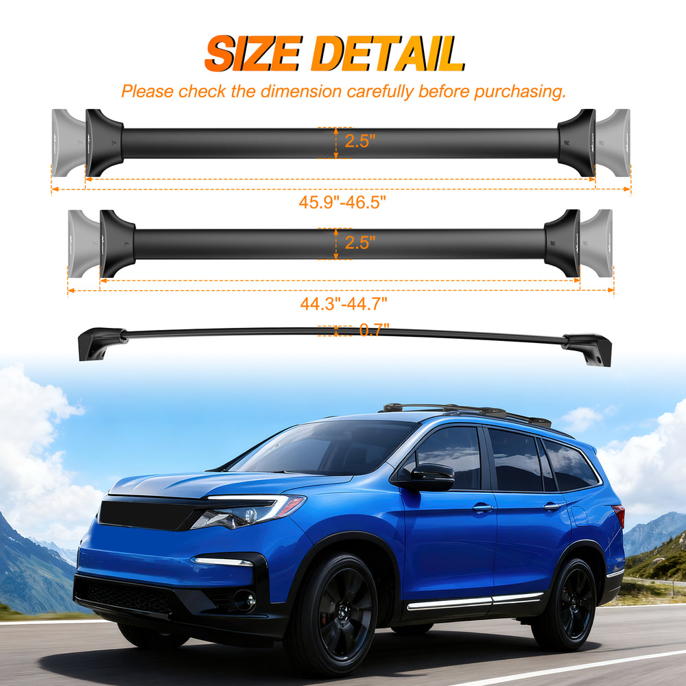 - High Quality & Special Design: The Honda Pilot LX EX EX-L roof rack cross bars are made from solid and high-strength aluminum. The thickness and width of the bar are 0.7" and 2.5", special internal structure design is very strong, which can firmly support items and is not easy to deform