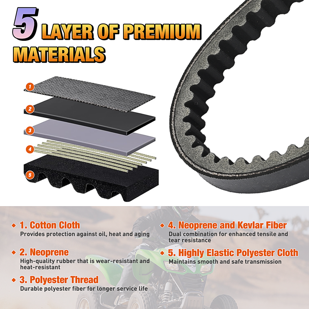 - PERFORMANCE BELT: This drive belt is made of high quality rubber and polyester thread for excellent flexibility and fit, high mileage and durability, ideal replacement belt for old belts. Tested in harsh environmental conditions for optimal performance in any terrain and weather conditions
