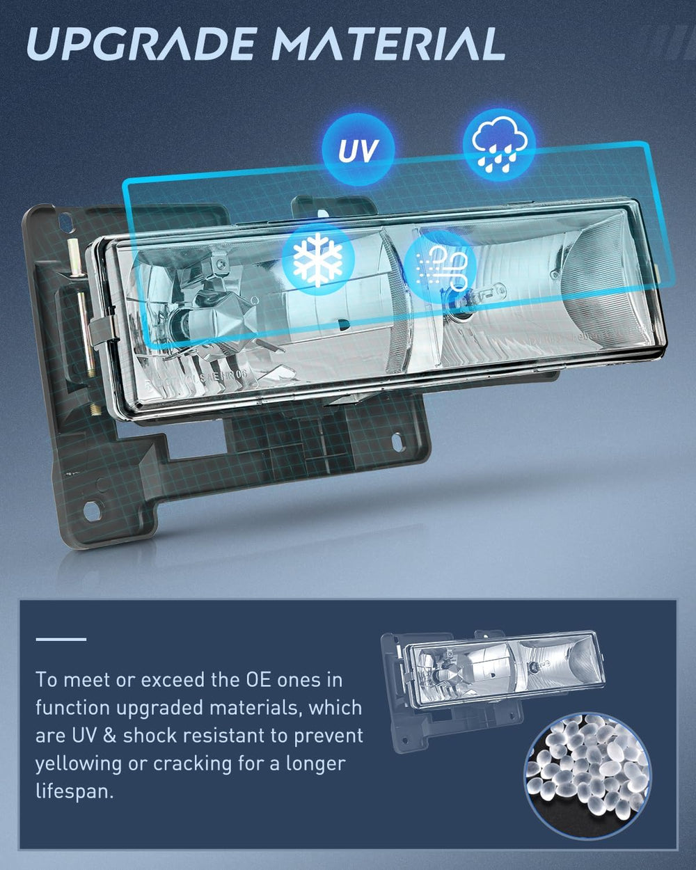 To meet or exceed the OE ones in function upgraded materials, which are UV & shock-resistant to prevent yellowing or cracking for a longer lifespan