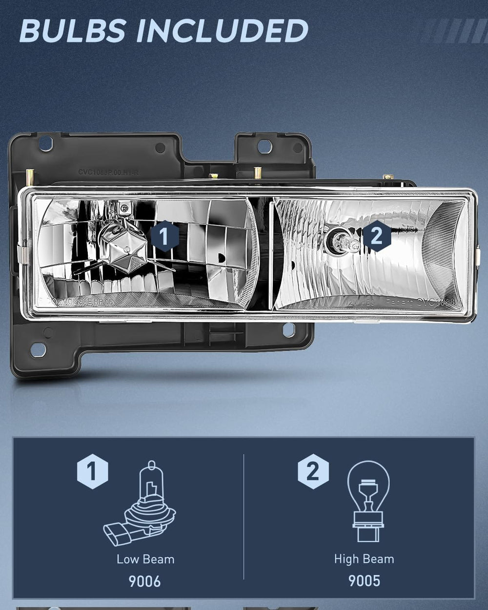 Compatibility: The headlight assemblies are compatible with 1988-1998 GMC Sierra, 1988-1998 Chevrolet Silverado, 1988-1998 Chevrolet/GMC pick up C10, 1988-1998 C/K 1500/2500/3500 truck models, 1992-1994 Chevrolet Blazer (full size) models, 1994-1999 Chevrolet Tahoe, 1992-1999 GMC Yukon, 1992-1999 Chevrolet/GMC Suburban. Do Not Fit SEAL BEAM VERSION. High beam bulb type: 9005;Low beam bulb type: 9006. Bulbs are included.