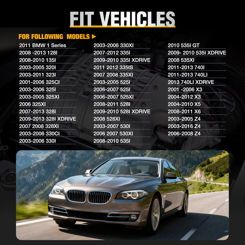 | Fit for BMW 525 528 530 | 2003-2005 BMW 525I L6 2.5L/2006-2007 BMW 525I L6 3.0L/2006-2007 BMW 525XI L6 3.0L/2008-2011 BMW 528I L6 3.0L/2009-2010 BMW 528I XDRIVE L6 3.0L/2008 BMW 528XI L6 3.0L/2003-2007 BMW 530I L6 3.0L/2006 2007 BMW 530XI L6 3.0L |