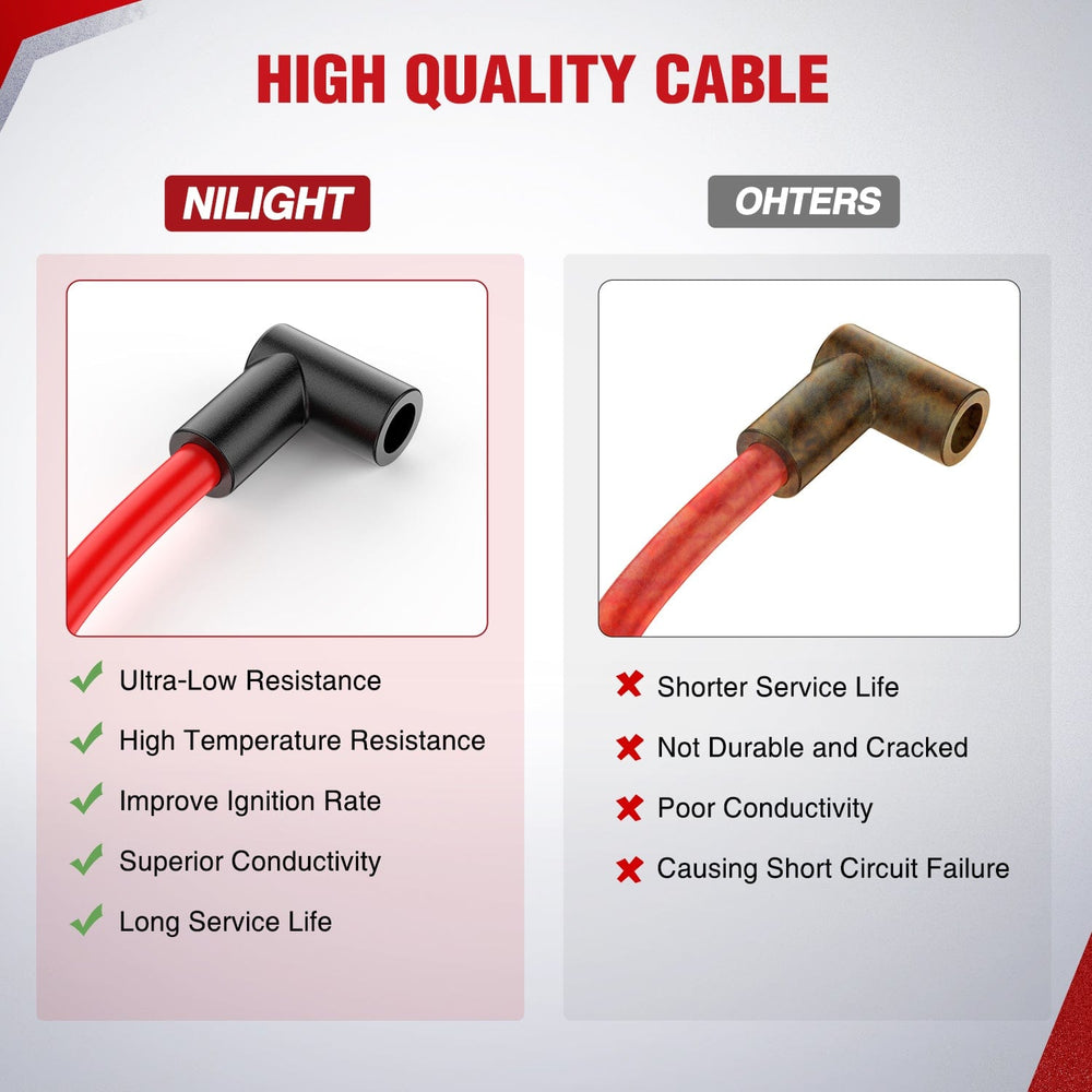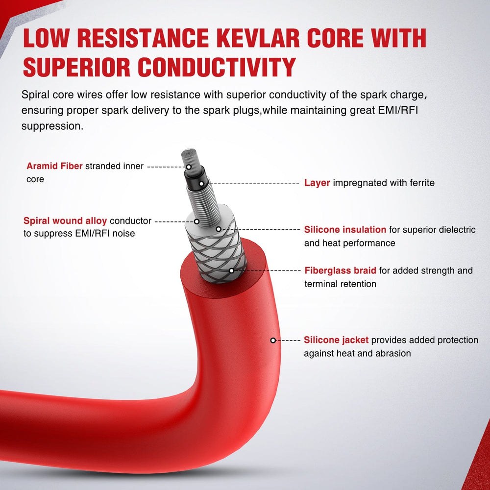 • High Performance: Spiral core wires offer low resistance with superior conductivity of the spark charge, ensuring proper spark delivery to the spark plugs,while maintaining great EMI/RFI suppression,without interfering radio frequency.Can improve ignition performance and smoother engine start