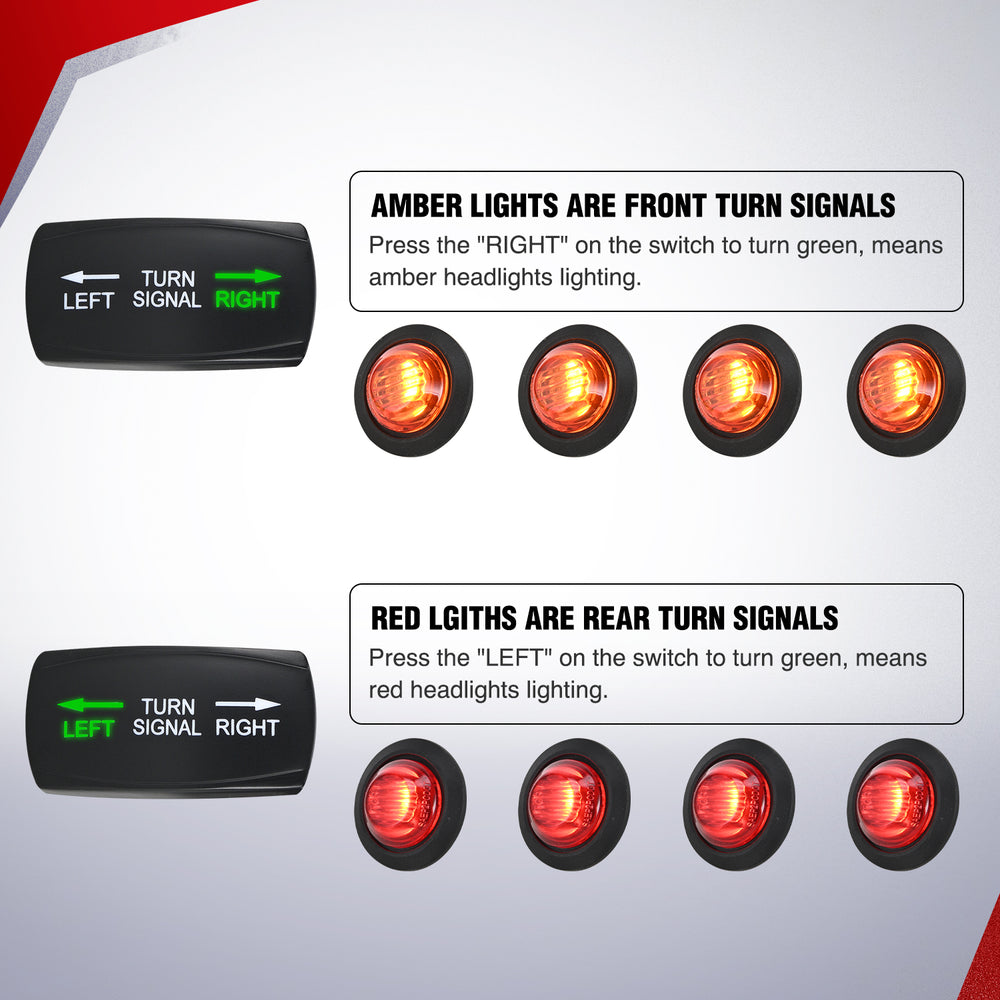 - SPDT Switch: The turn signal switch has 3 positions, you can control the turn signal light to left and right by pressing the switch to the corresponding positions. Press the "RIGHT" on the switch to turn green, means amber headlights lighting and press the "LEFT" on the switch to turn green, means red headlights lighting. The middle words “TURN SIGNAL” stands for nothing and it’s an off position.