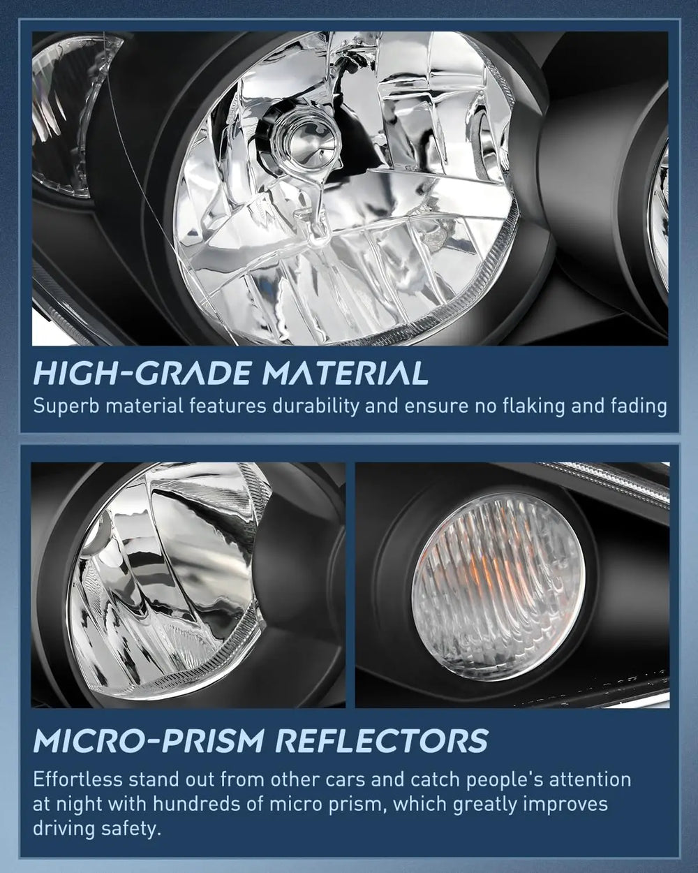 To meet or exceed the OE ones in function upgraded materials, which are UV & shock-resistant to prevent yellowing or cracking for a longer lifespan