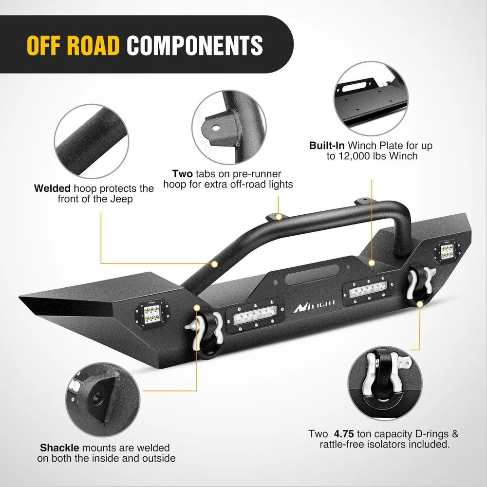 - OFF-ROAD Front Bumper: The Nilight rock crawler front bumper is equipped with 9,500 lb. rated D-Rings & Built-in 4 x 18W Nilight Upgraded LED lights for impressive styling. The JK Wrangler front bumper features a built-in winch plate that is capable of supporting a 12,000 lb. winch.