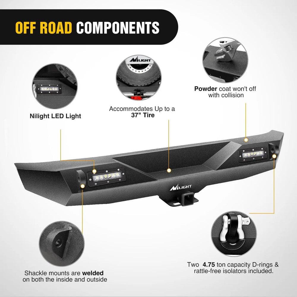 - Rear Bumper: The JK rear bumper is equipped with a 2in standard hitch receiver, two high strength D-Ring mounts with 9,500 lb. rated D-Rings & Built-in 2pcs 18W Nilight Upgraded LED lights.