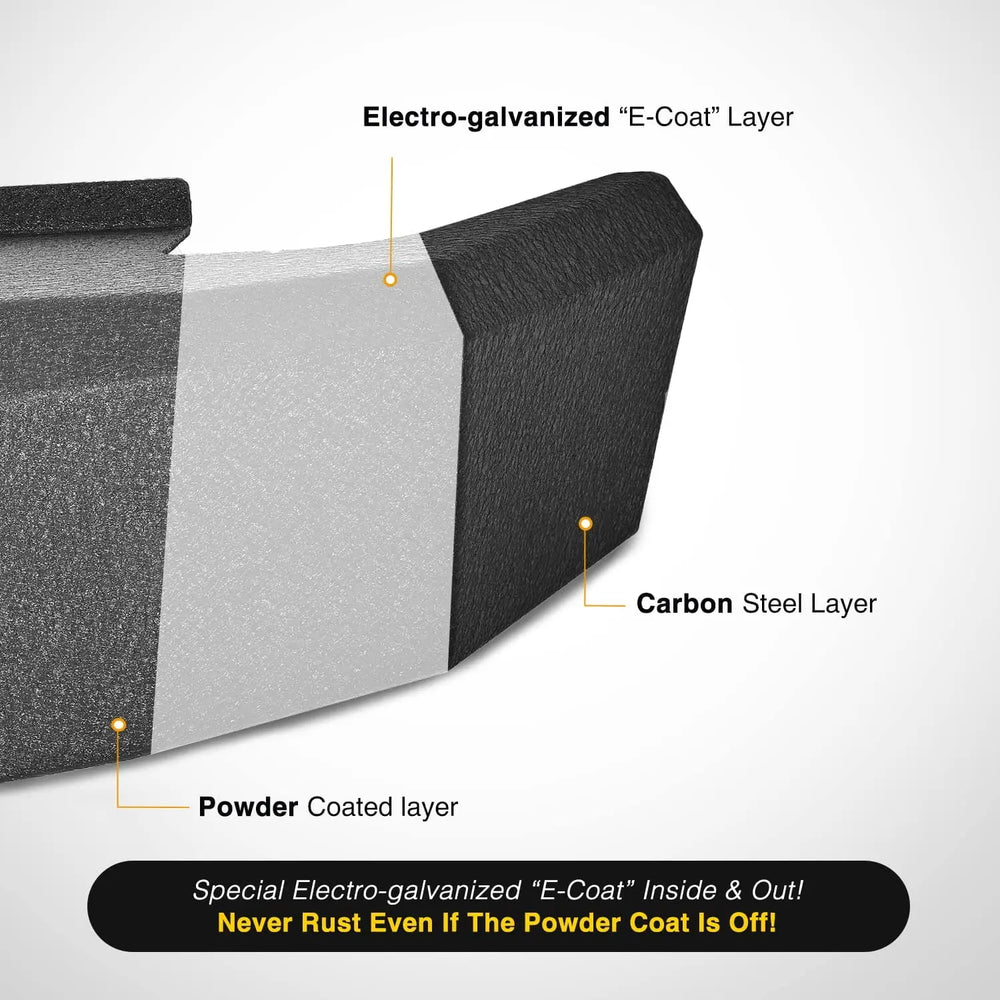 Welded by high-quality carbon steel. premium E-coating process and textured black powder coat finish make the wear resistance and corrosion resistance of the rear bumper better, Give your car a tougher look & 360° Protection.