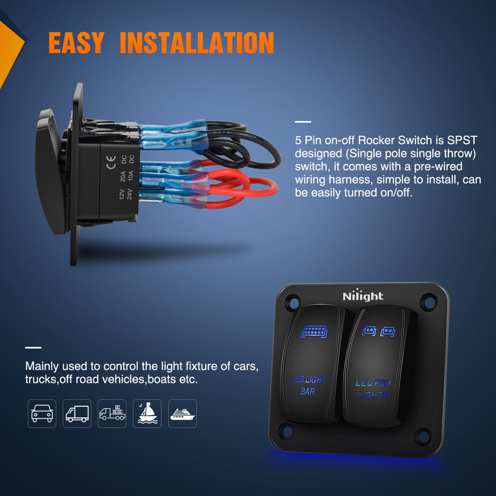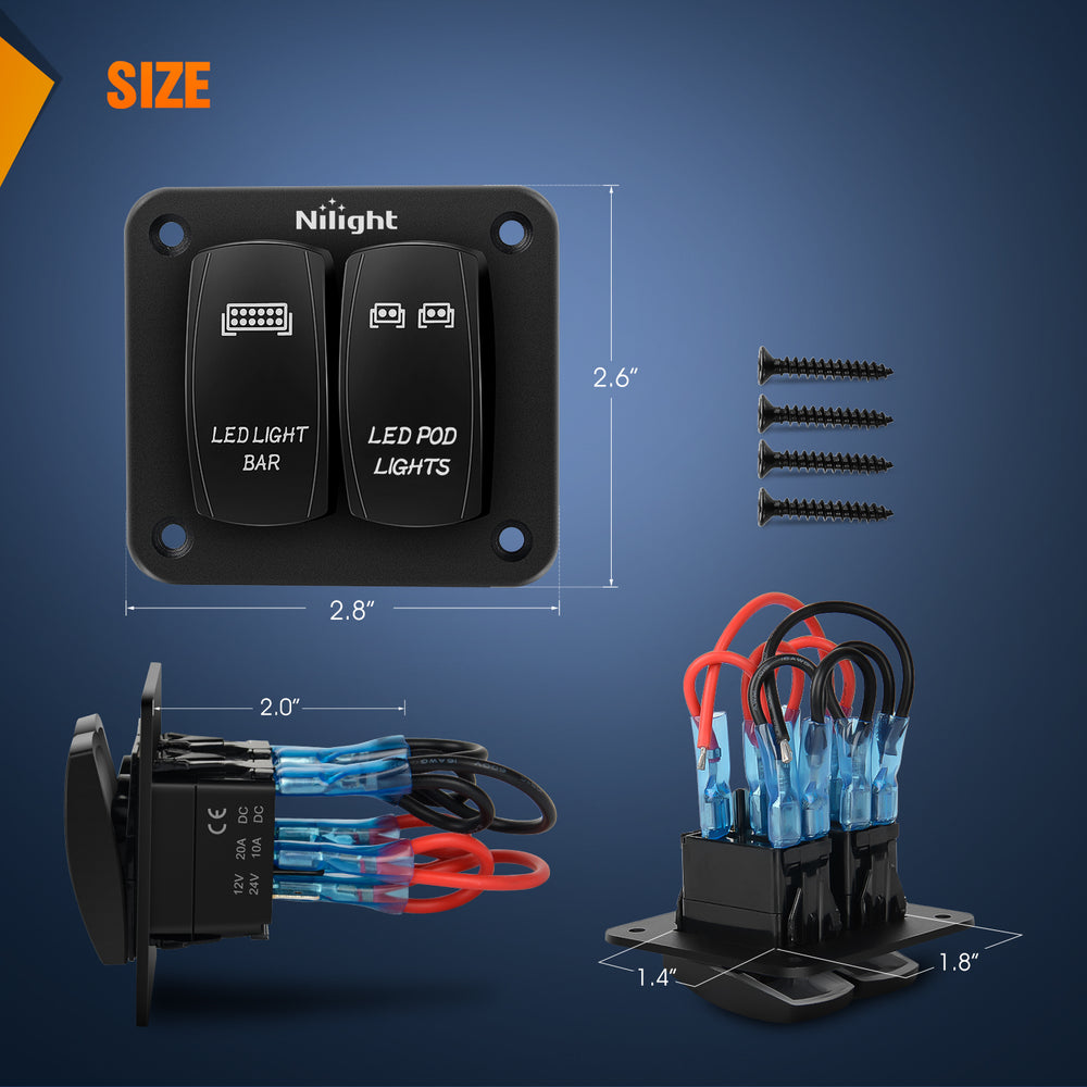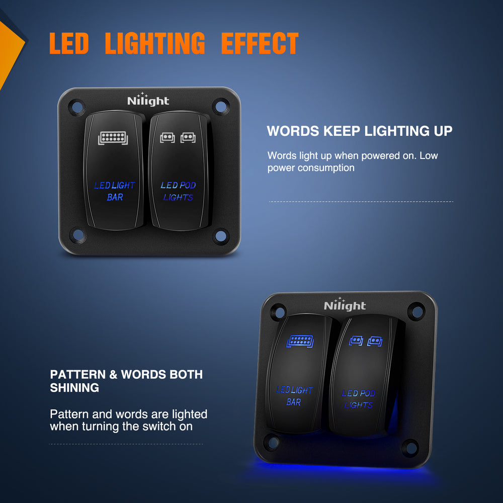 Nilight 2 gang switch panels can be used to control LED light bar, LED work lights, rear light, fog lamps, driving lights, headlights, taillights, off-road lights, auxiliary lights, boat light, etc. Equipped with a sticker, you can define the name and assign switches according to your needs.