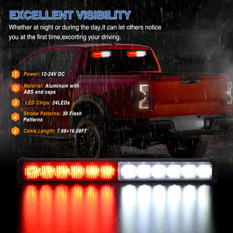 24LED Emergency Strobe Traffic Advisor Light Bar 2 in 1 Red White Dash Warning Safety Flashing Lights Front/Rear Windshield Construction Lights for Trucks Cars Plow Police Firefighter Vehicles