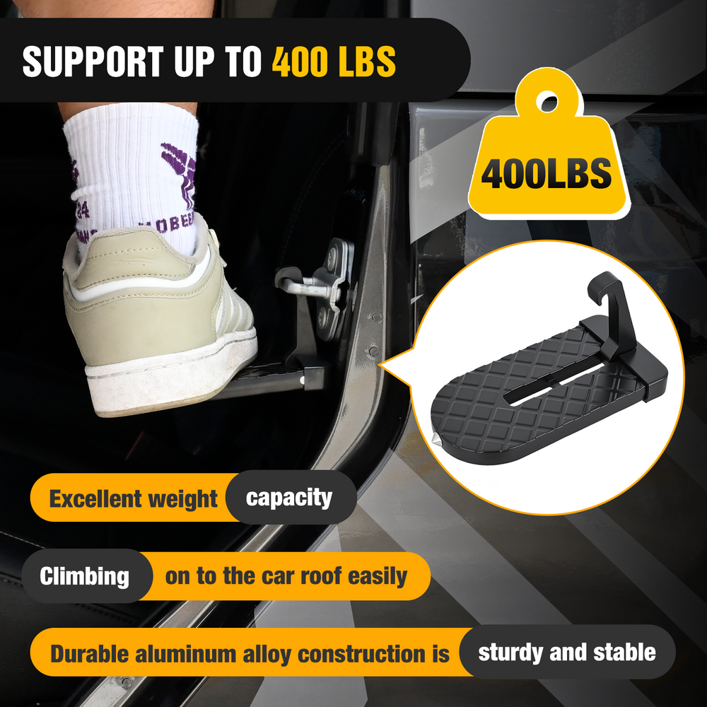 • Sturdy & Durable: This car door latch step is made of high-quality aluminum alloy which is light and sturdy, offering exceptional strength and longevity. The maximum load capacity can reach 400lbs, providing reliable support for various tasks. This folding door step is a must-have accessory for easy rooftop access, making your outdoor activities more convenient and enjoyable.
