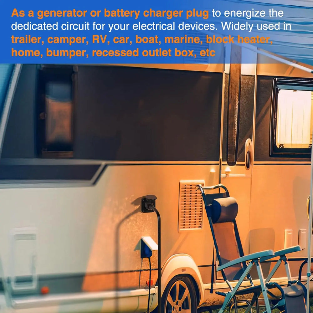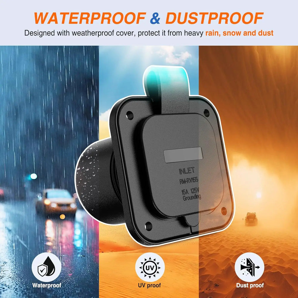 - 15AMP RV Power Inlet: NEMA 5-15P. Rated for 15AMP 125V, this RV power inlet is widely used in RVs, campers, trailers, boats, caravans, motorhomes, vans, or sheds. As a generator or battery charger plug to energize your electrical devices. The weatherproof cover makes the product waterproof and dustproof.