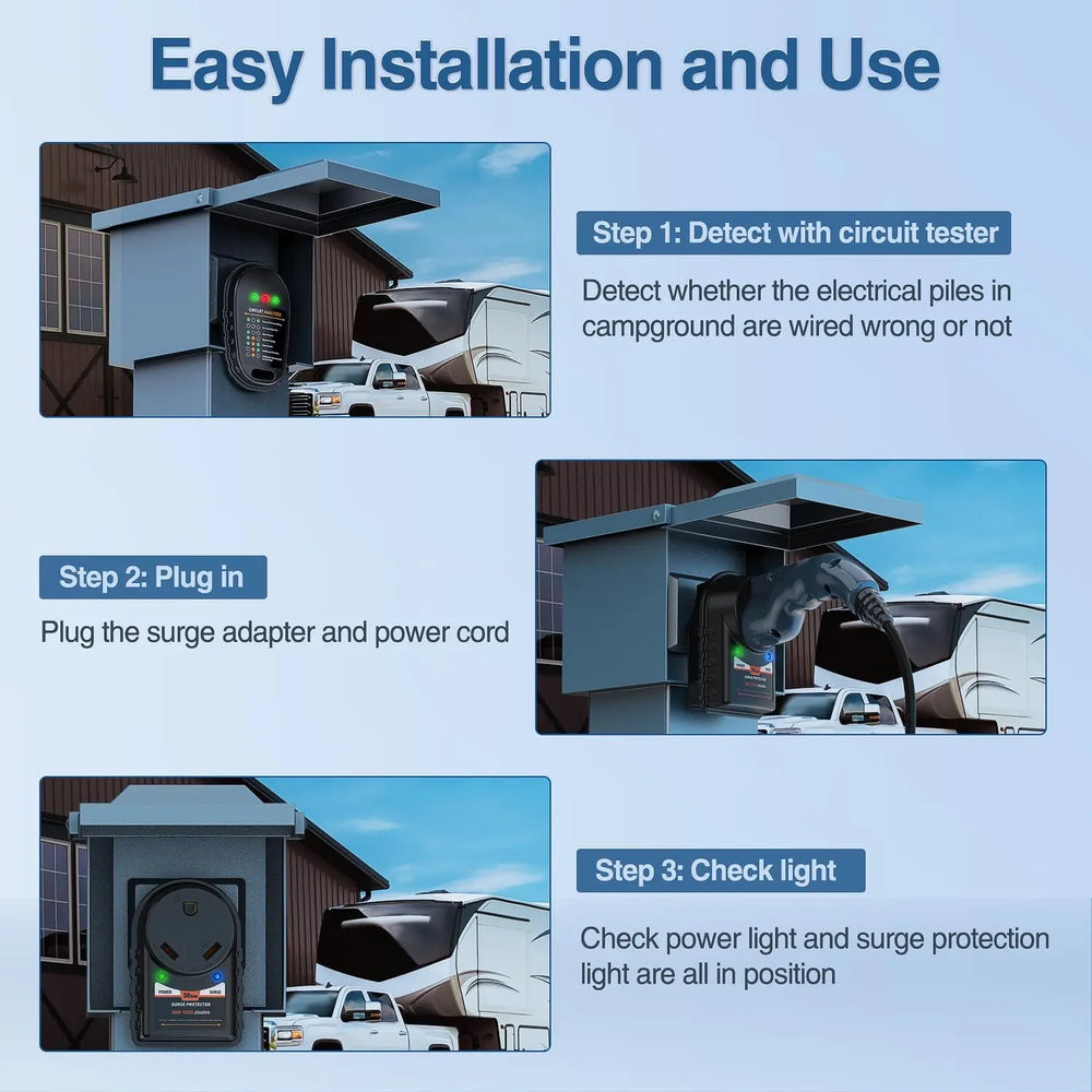 - Easy Use: Anti-slip design increases friction and makes plugging and unplugging much easier. Step1: Detect whether the electrical piles in campground are wired wrong or not with circuit tester. Step2: If the wiring is correct, plug in the surge adapter and power cord. Step3: Check power light and surge protection light are all in position. Note: Before plugging the surge adapter and circuit tester into the power pedestal, make sure the corresponding circuit breakers are in the OFF position.
