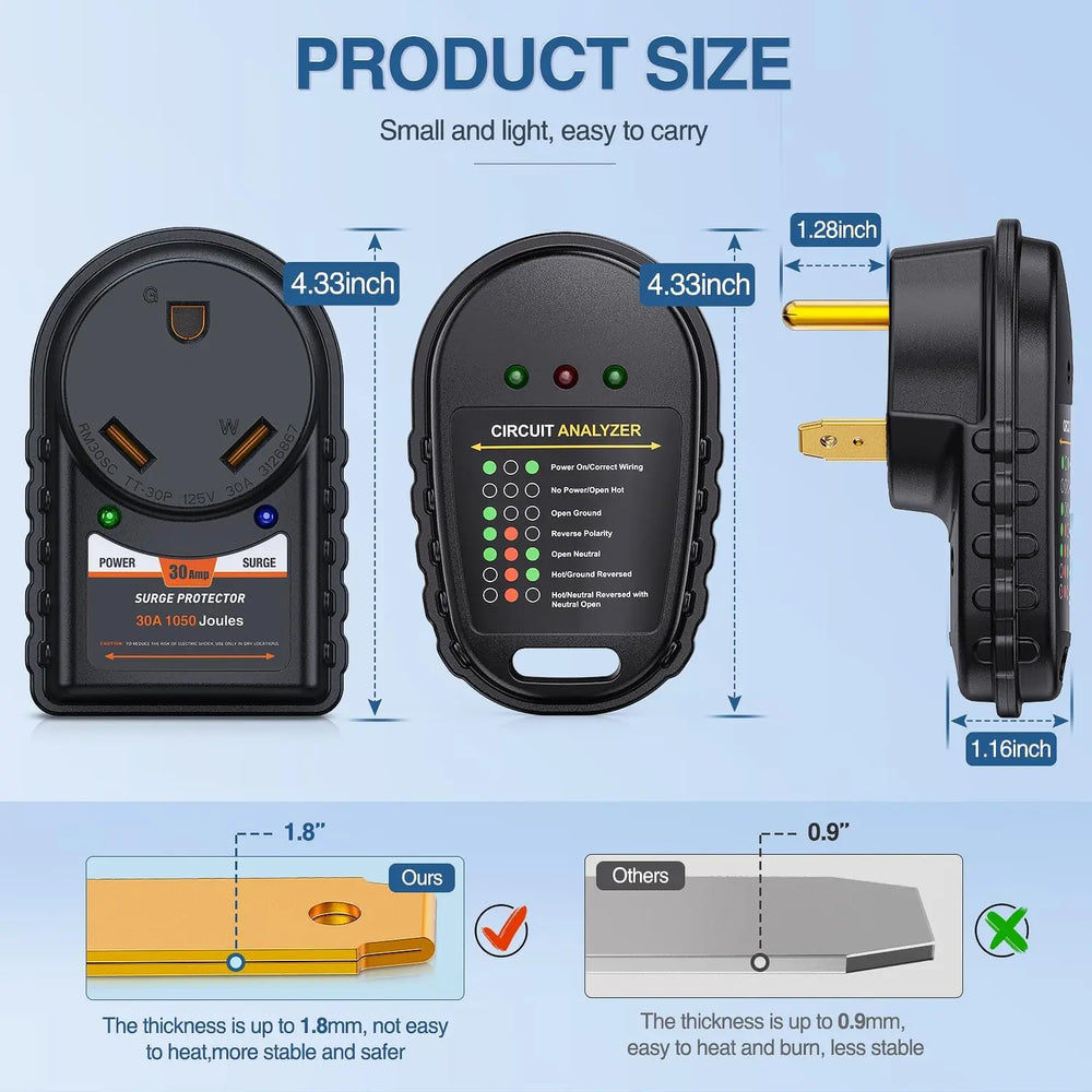 - Package includes: 30 amp RV surge protector, 30 amp circuit tester, installation guidance. 2 Year Warranty by Nilight.