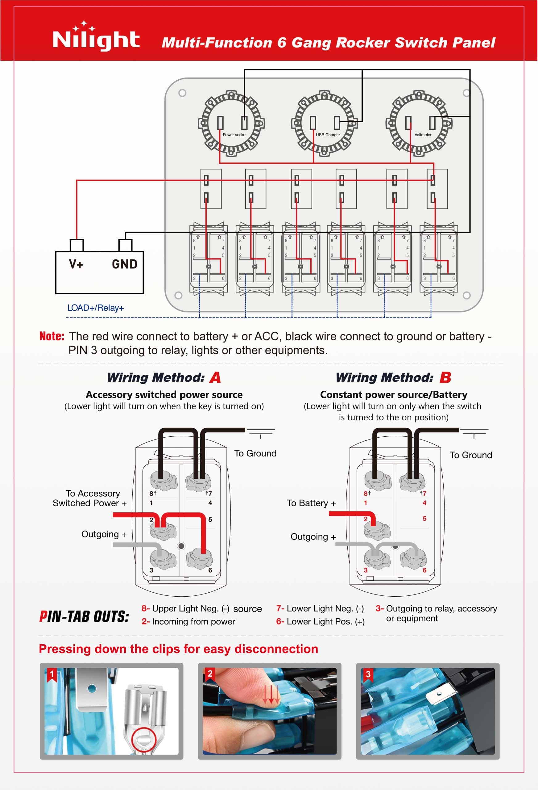 - Multi-function Switch Panel 6 On/Off 5pin Red LED rocker switch 6 circuit breakers for overload protection 12V cigarette socket 5V/2.1A & 5V/1A dual USB charger port and digital voltmeter great for all types of circuit control charging needs and voltage monitoring