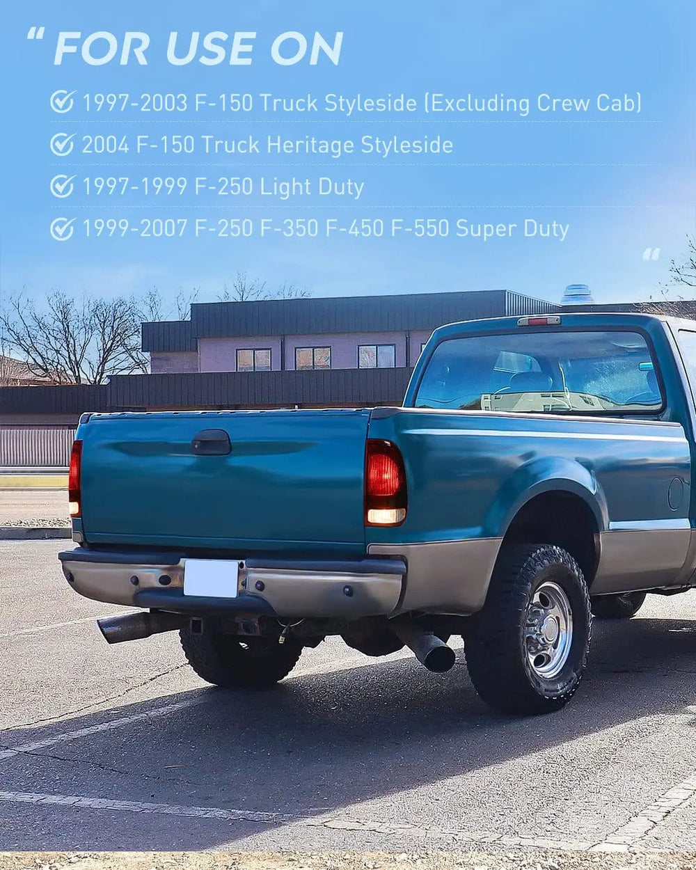 Compatibility: The taillight assemblies are compatible with 1997-2003 F-150 Truck Styleside (Excluding Crew Cab); 2004 F-150 Truck Heritage Styleside; 1997-1999 F-250 Light Duty; 1999-2007 F-250 F-350 F-450 F-550 Super Duty. PARTSLINK: FO2800117, FO2801117. OE Part Number: F85Z-13405-CA, F85Z-13404-CA. Please confirm the vehicle fitment before ordering.