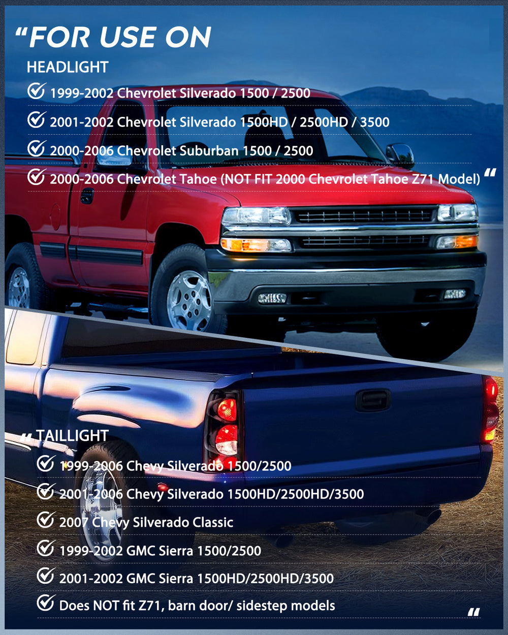 - Compatibility: The headlight and taillight assemblies are compatible with 1999-2002 Chevy Silverado 1500;2001-2002 Chevy Silverado 1500HD;1999-2002 Chevy Silverado 2500;2001-2002 Chevy Silverado 2500HD;2001-2002 Chevy Silverado 3500. Not suitable for Barn Door, Stepside models. Not suitable for chevy tahoe. Please confirm the vehicle fitment before ordering