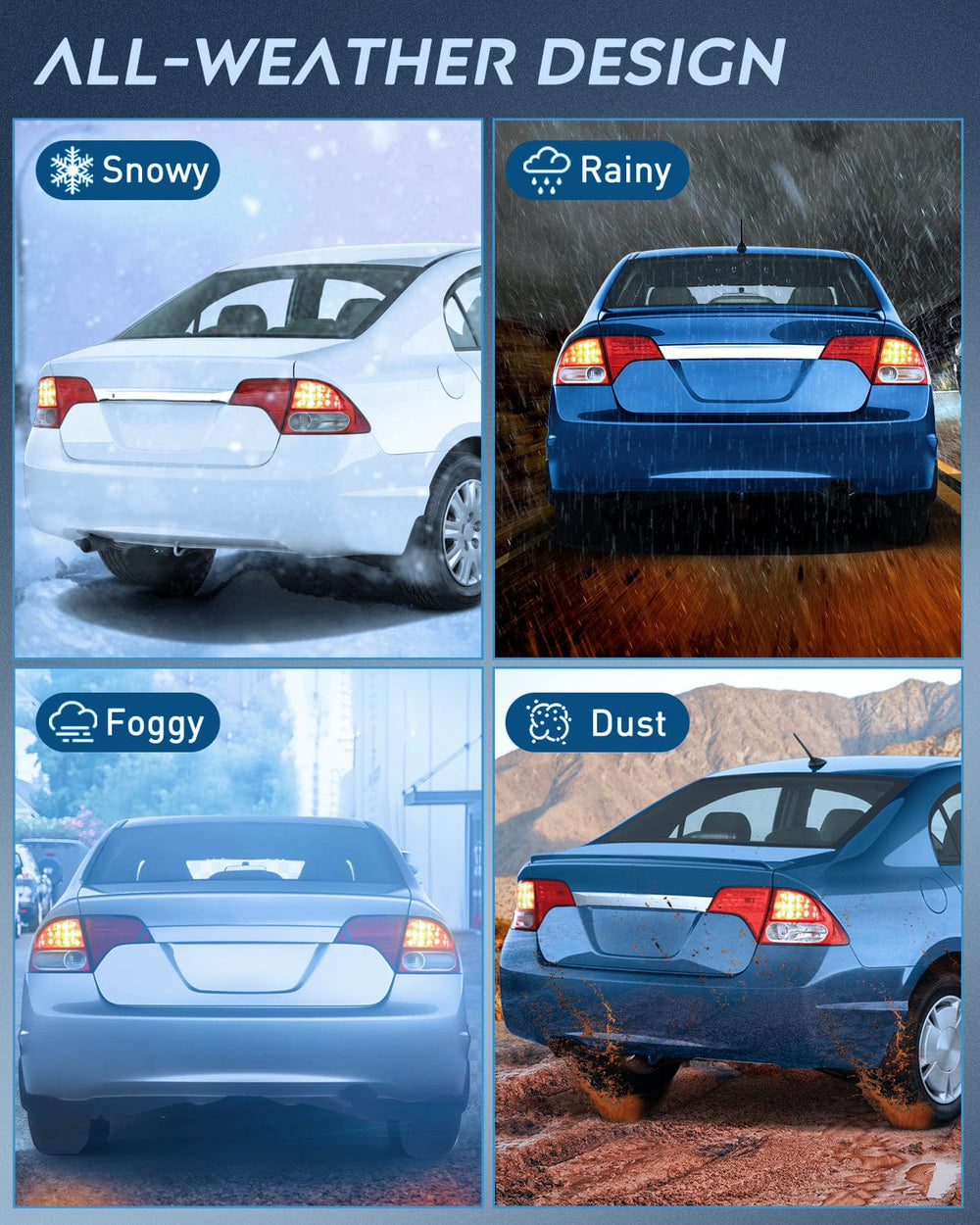 - Durability: The high-impact housing withstands shock and vibration. With fully sealed silicon prevents environmental damages including freezing, foggy, fading, corrosion, and provides reliable service in sorts of weather conditions such as rain, snow, or dust storms, enabling your car looks better and drive safer.