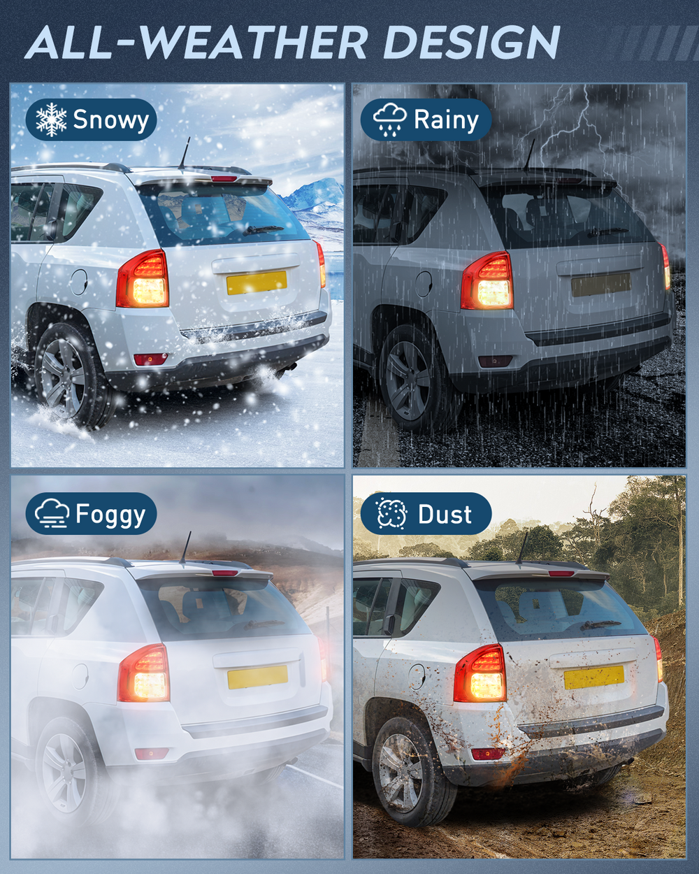 - Durability: The high-impact housing withstands shock and vibration. With fully sealed silicon prevents environmental damages including freezing, foggy, fading, corrosion, and provides reliable service in sorts of weather conditions such as rain, snow, or dust storms, enabling your car looks better and drive safer.
