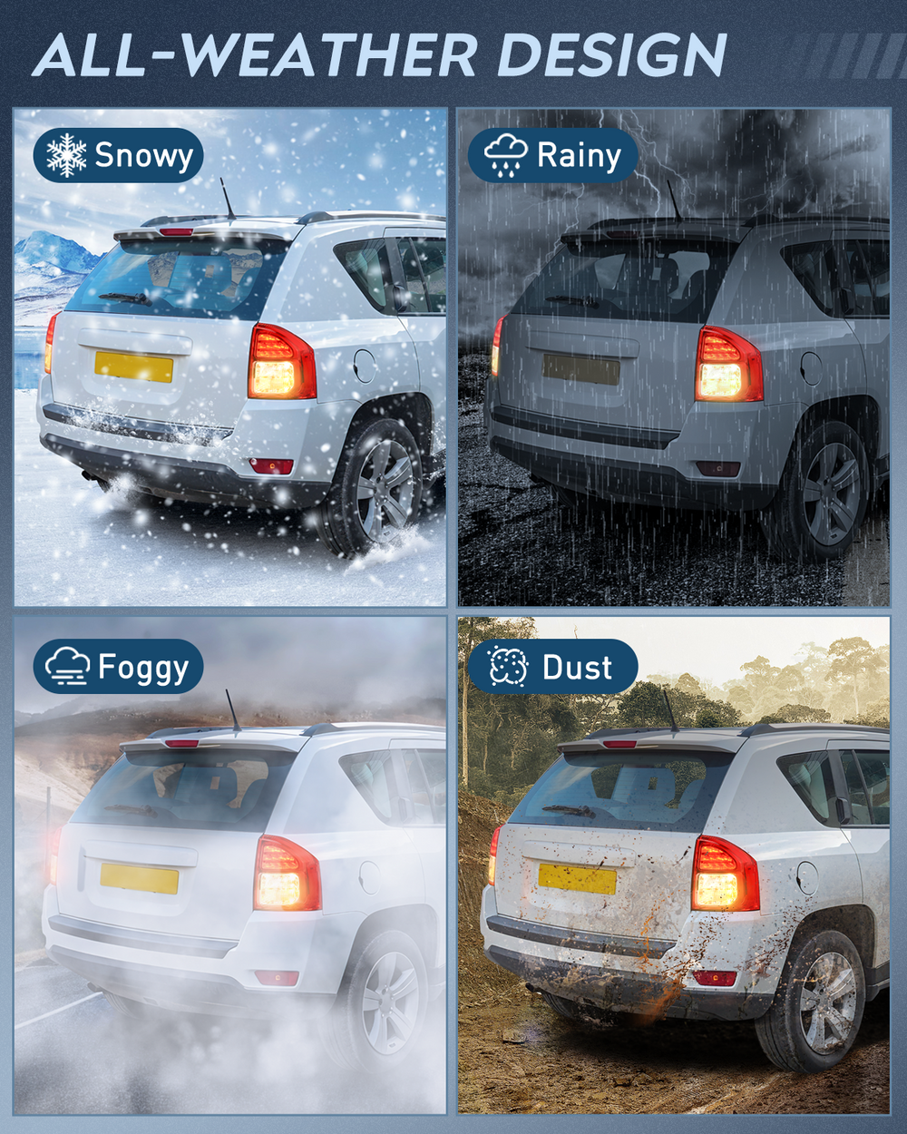 - Durability: The high-impact housing withstands shock and vibration. With fully sealed silicon prevents environmental damages including freezing, foggy, fading, corrosion, and provides reliable service in sorts of weather conditions such as rain, snow, or dust storms, enabling your car looks better and drive safer.