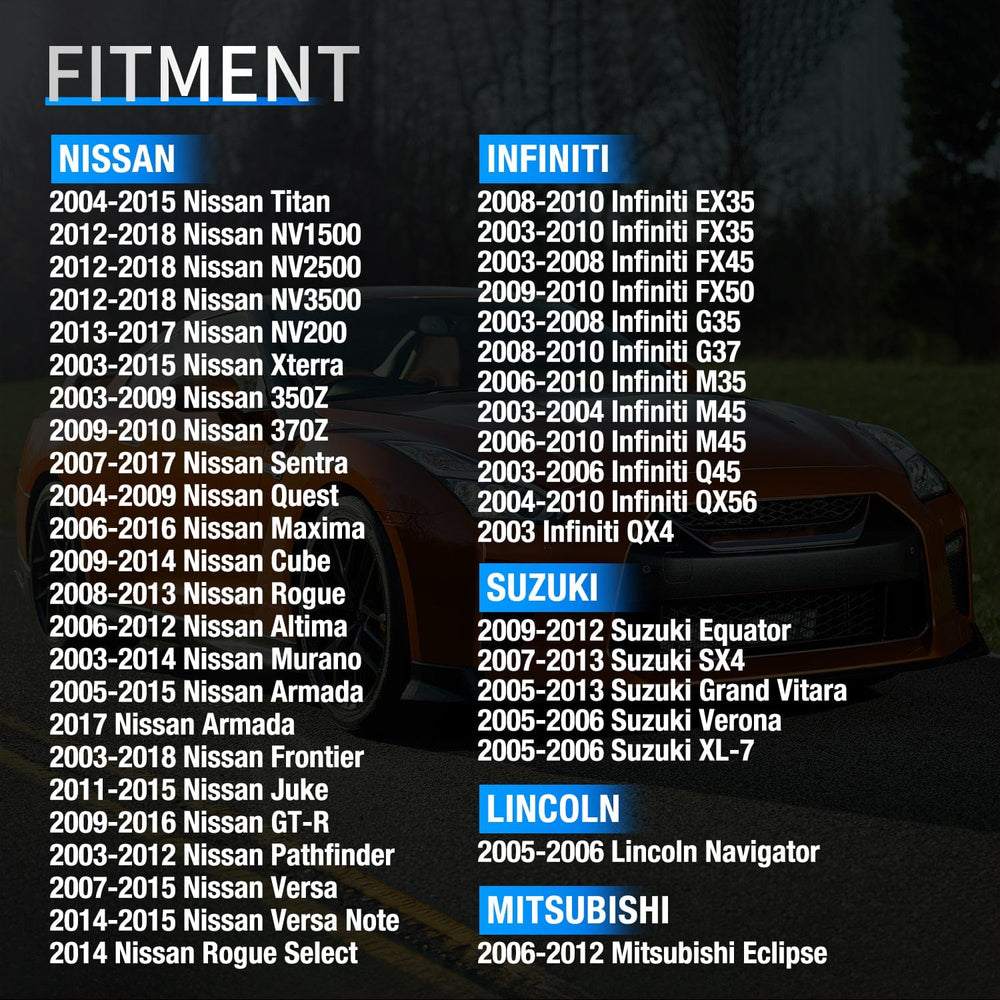 - For Nissan: 2003-2009 Nissan 350Z, 2009-2010 Nissan 370Z, 2007-2012 Nissan Altima, 2013 Nissan Altima Coupe, 2004-2015 Nissan Armada Titan, 2009-2014 Nissan Cube, 2003-2021 Nissan Frontier, 2009-2022 Nissan GT-R, 2011-2015 Nissan Juke, 2006-2015 Nissan Maxima, 2003-2014 Nissan Muran, 2013-2021 Nissan NV200, 2003-2012 Nissan Pathfinder, 2004-2009 Nissan Quest, 2008-2013 Nissan Rogue, 2014-2016 Nissan Rogue Select, 2007-2019 steel Nissan Sentra Versa(SL Model can not fit), 2014-2021 Nissan Versa Note(SL Model can not fit), 2003-2004 Nissan Xterra.