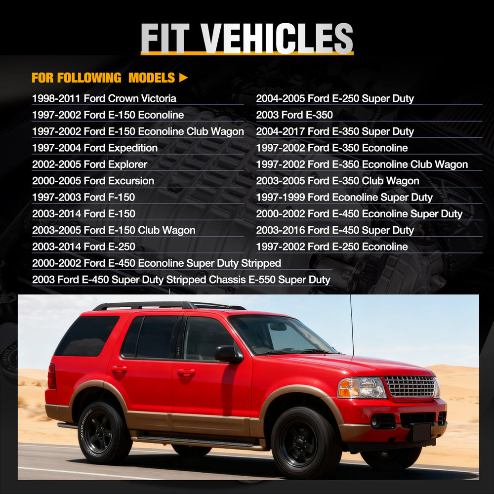 | Compatible with 5.4L Engine | 1997-2002 Ford E-150 Econoline (Club Wagon)/1997-2002 Ford E-250 E-350 Econoline/1997-2002 Ford E-350 Econoline Club Wagon/2003 Ford E-350/2003-2005 Ford E-350 Club Wagon/2004-2005 Ford E-250 Super Duty/2004-2016 Ford E-350 Super Duty/1997-1999 Ford Econoline Super Duty/1997-2003 Ford F150/1997-2004 Ford Expedition/2000-2002 Ford E-450 Econoline Super Duty (Stripped)/2000-2005 Ford Excursion/2003 Ford E-450 Super Duty Stripped Chassis/2003-2016 Ford E-450 |