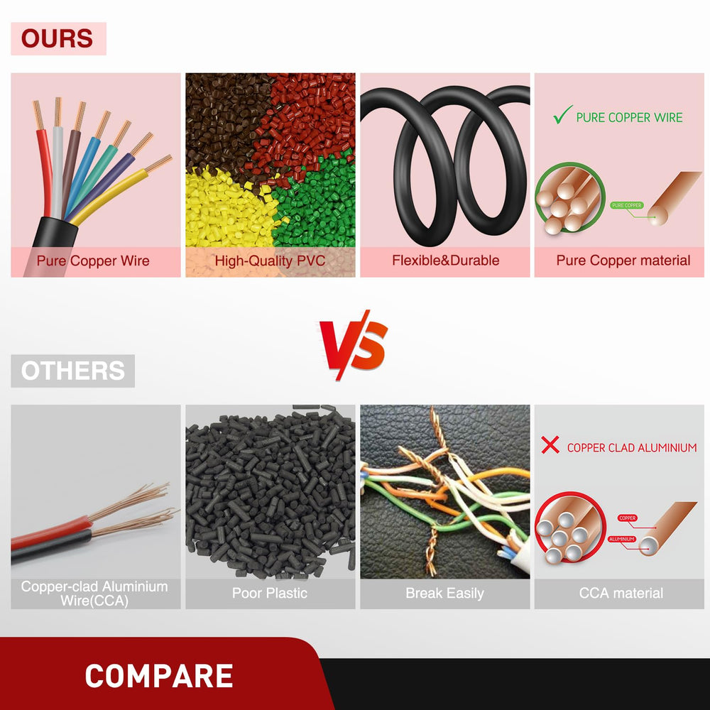 Our wires are made of 100% pure copper with 14 Gauge 7 Conductor Stranded Wire. Solid copper provides better and faster signals than CCA wires.