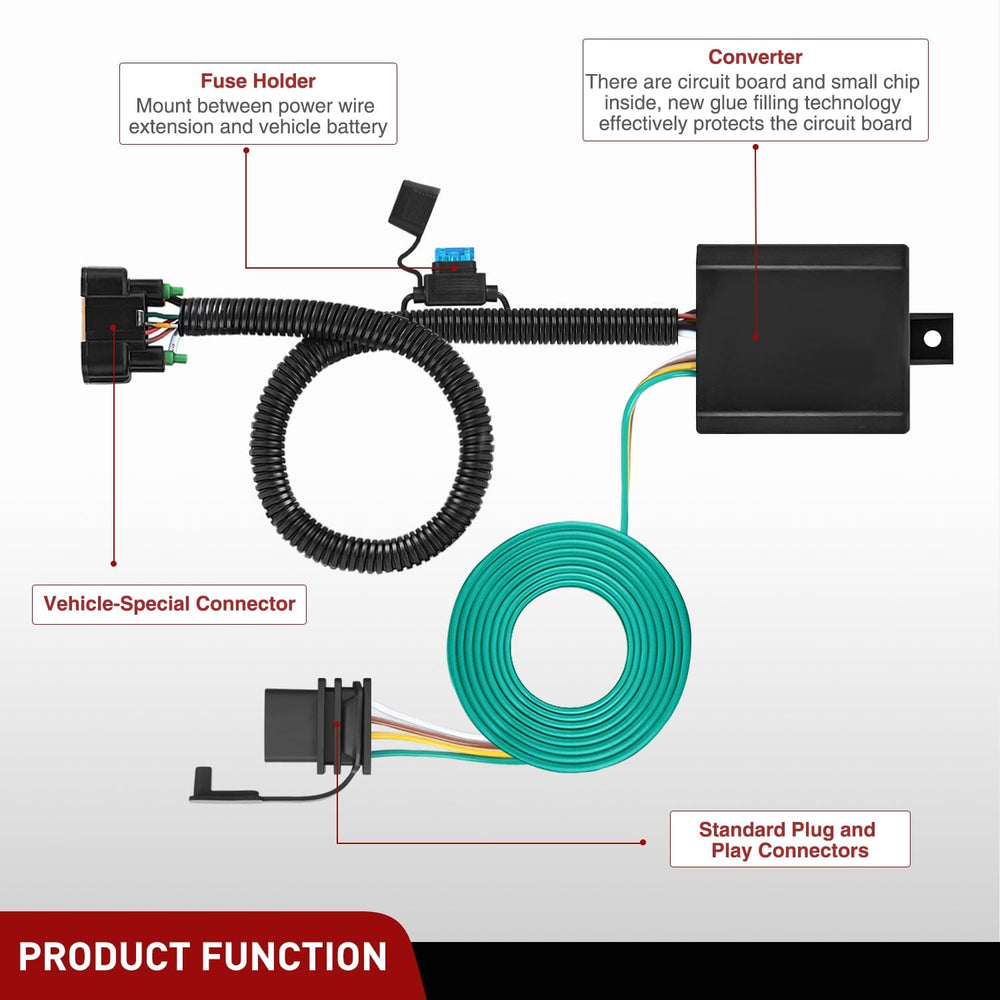 With Standard 4-way trailer plug, simple plug-and-play design, provide a 4-Way flat for plugging in and towing a trailer.