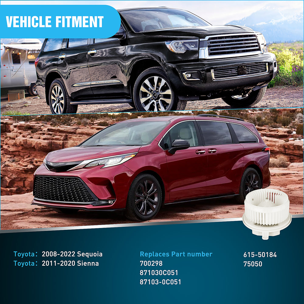 HVAC Heater Blower Motor Fit for Toyota Sequoia 2008 2009 2010 2011 2012 2013 2014 2015 2016 2017 2018 2019 2020 2021 2022, Sienna 11-20 Front Side, Replace# 87103-0C051 700298 75050