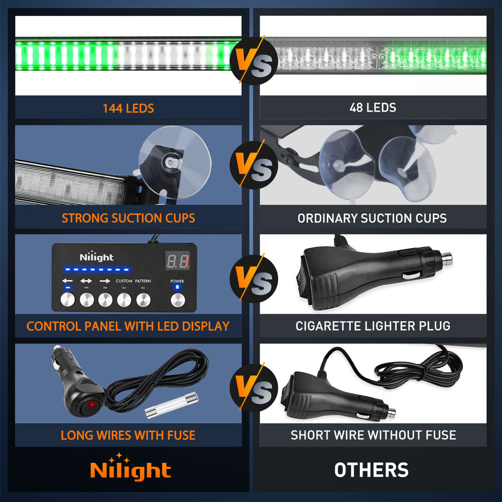 • Super Bright And High Visiblity: Nilight Traffic Advisor Strobe Light Bar has a total of 144 high-power LED chips with aluminum housing and PC lens. Provided maximum illuminate coverage and output bright warning signal from greater distance. Visible in daylight, midnight, rainy, foggy or snow days
