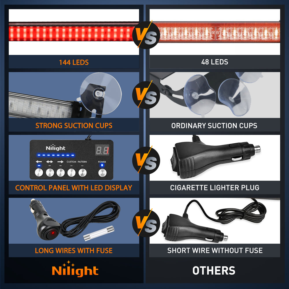 - Super Bright And High Visiblity: Nilight Traffic Advisor Strobe Light Bar has a total of 144 high-power LED chips with aluminum housing and PC lens. Provided maximum illuminate coverage and output bright warning signal from greater distance. Visible in daylight, midnight, rainy, foggy or snow days