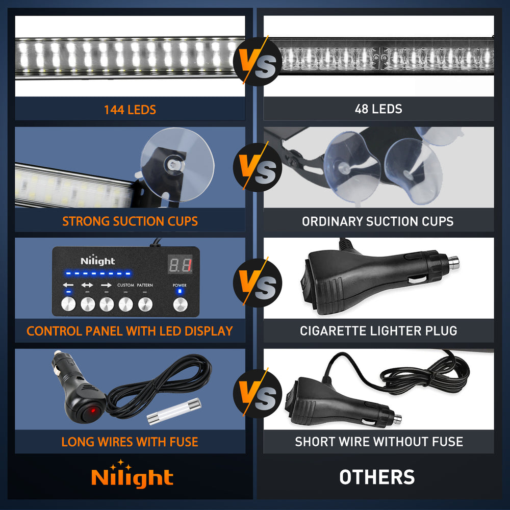 - Super Bright And High Visiblity: Nilight Traffic Advisor Strobe Light Bar has a total of 144 high-power LED chips with aluminum housing and PC lens. Provided maximum illuminate coverage and output bright warning signal from greater distance. Visible in daylight, midnight, rainy, foggy or snow days