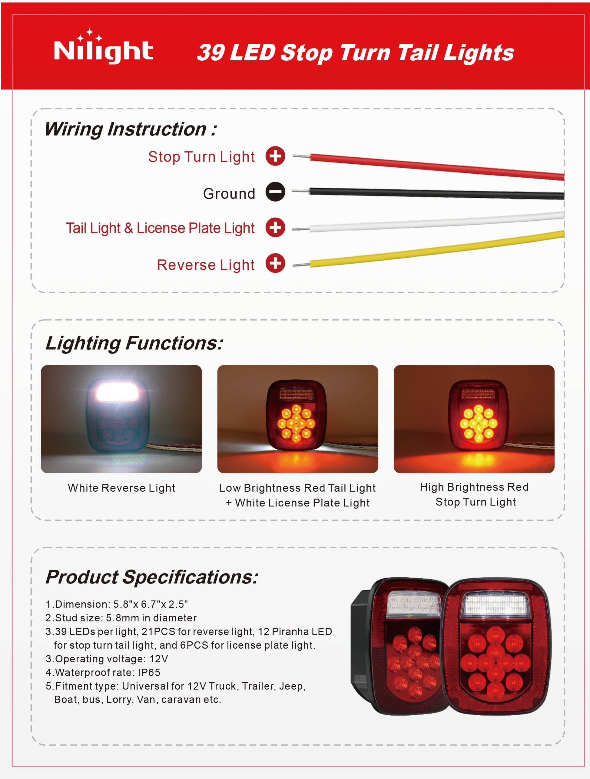 - Multi-function Combination: Each light comes with 39 LEDs, top 12 LEDs for white reverse light, medium 12 Piranha LED for red stop turn tail light, bottom 6 LEDs for white license plate light