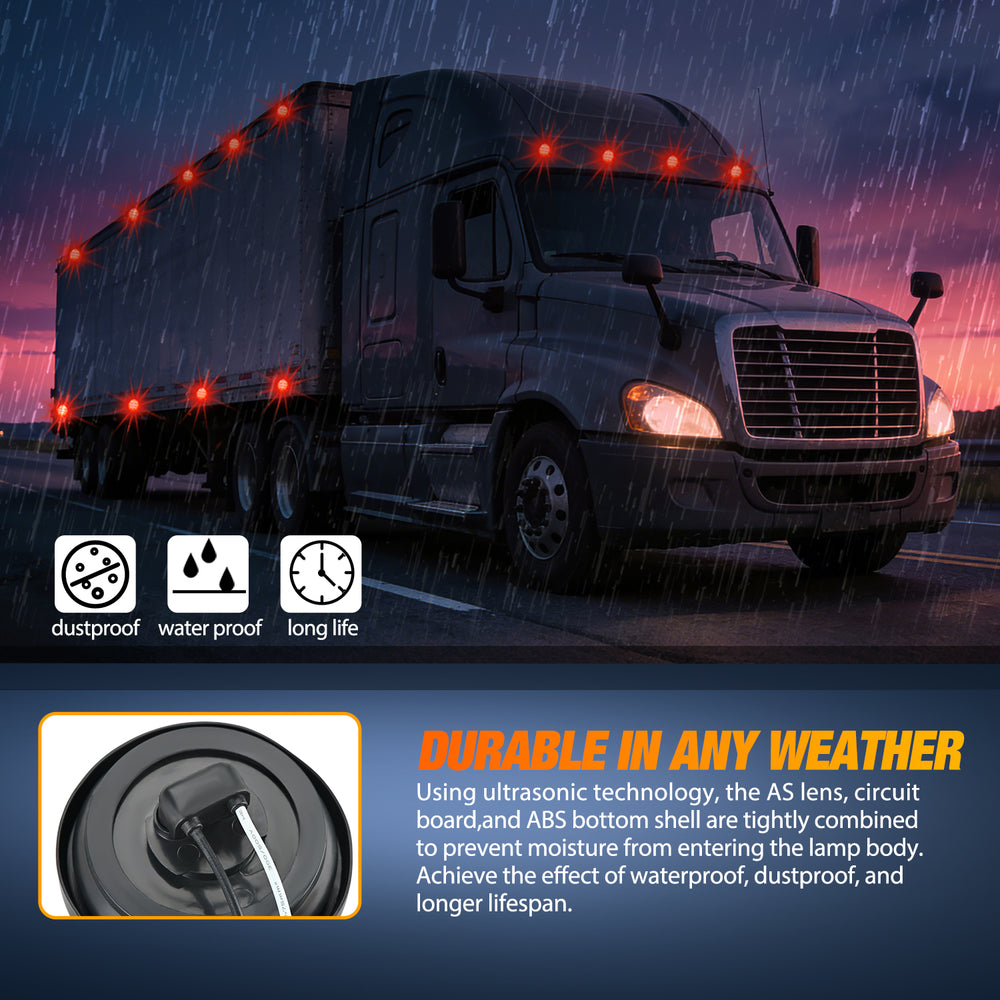 Marker light uses ultrasonic technology to embed the AS lens and ABS bottom shell together. Moisture will not enter the lamp, effectively ensuring its waterproof ability.