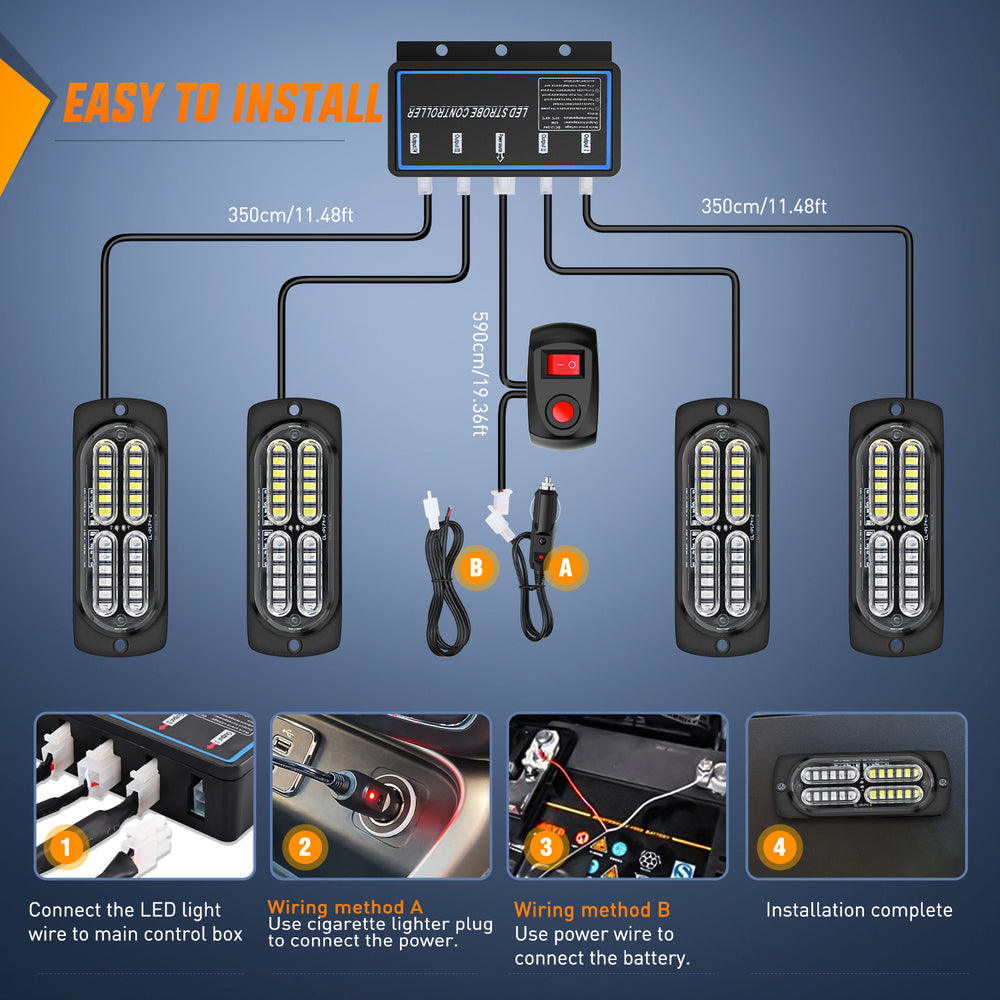 - Easy To Install: Upgrade design, this emergency strobe lights with main control box for free wiring installation, it can perfectly synchronized your lights. 11.48FT long wire of each raw of light can meet the installation needs of various large vehicles. Protective mounting gaskets and screws are included for easy installation