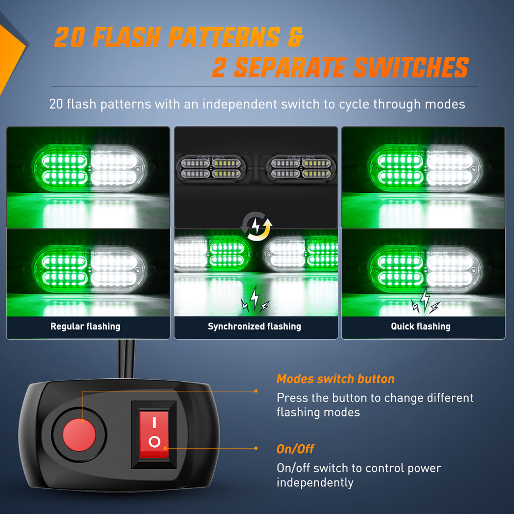 - Super Bright: 4Pcs Surface Mount Green White Strobe Lights are consists of 4pcs double row 24 LED chips, provided maximum illuminate coverage and be visible from greater distance. Visible in daylight, midnight, rainy, foggy or snow days