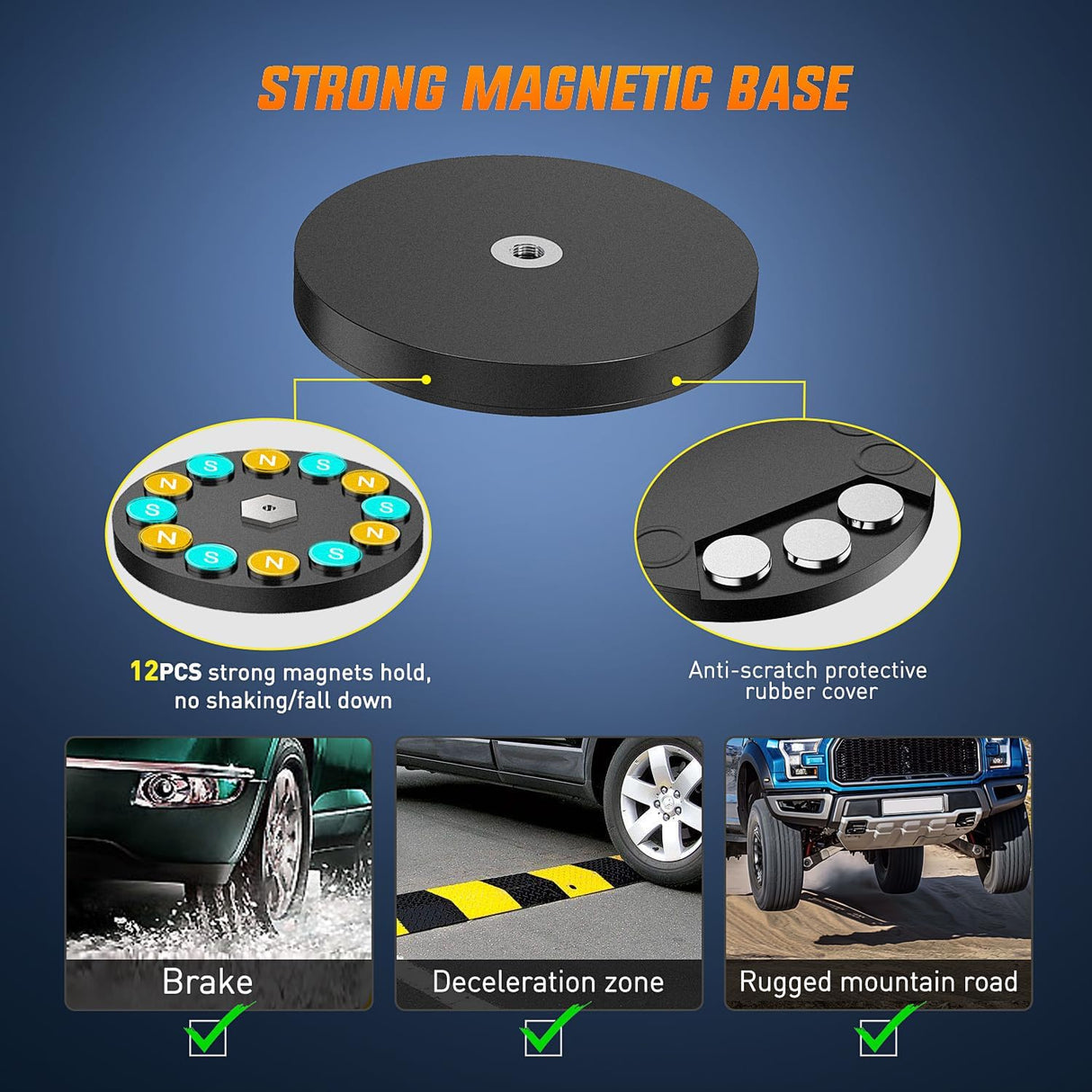 - Adjustable & No Drill: The bracket is a 360° adjustable design. The strong magnetic base can be adsorbed on the iron surface of the vehicle without drilling holes. Once matching well with the flat surface, it is strongly held even on emergency braking or driving on a rugged mountain road