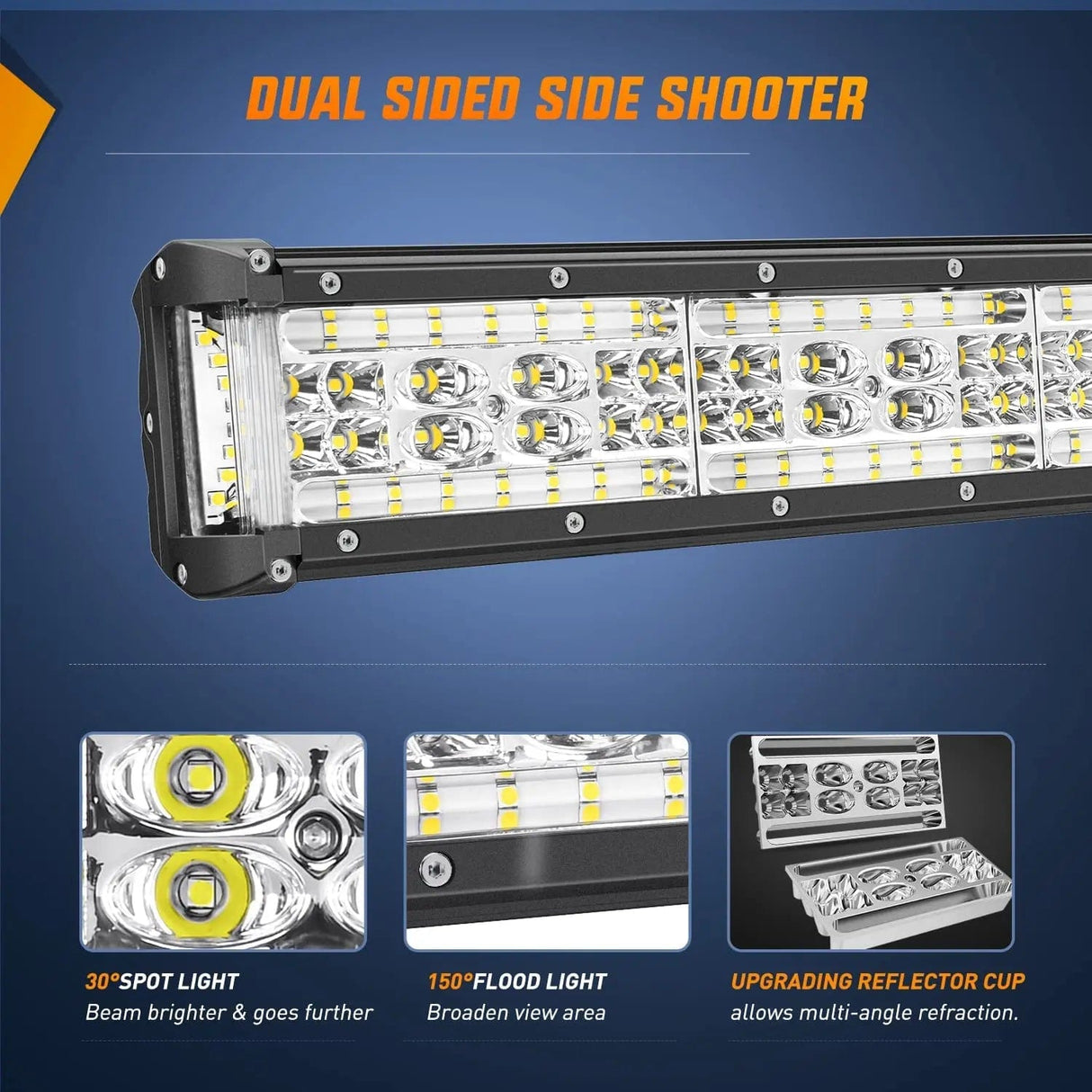 Upgrade Side Shooter Design: Designed with side lights at two ends, quadruple rows of daul sided lights and nested reflector cup design combined beam, flood and spot combo beam, shoots out a 220° wider and further light coverage to clear darkness and potential hazard, increasing your driving safety. Works great as fog lights, side lights, driving lights, etc.