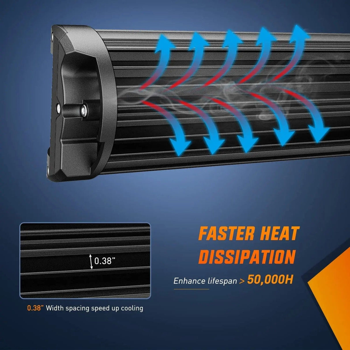 Super Bright: 300W LED Light bar, consist of 50 pcs flood beam LED chips, 34 pcs spot beam LED chips and 16 pcs spot beam LED chips of daul side . 100 pcs superior-quality chips emit 5800-6000k bright white light, higher light transmission rate polycarbonate lenses - reduce optical loss, delivering 23,500 lumens and ensuring that objects far clearly visible to prevent potential threats, offering you an unparalleled driving experience.