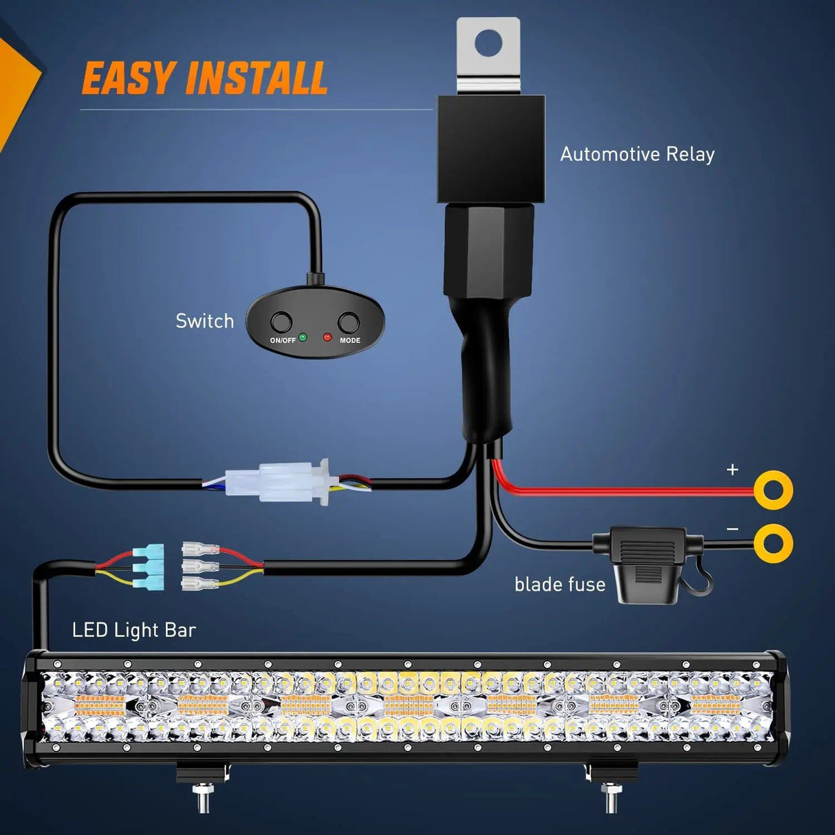 6 Modes with Memory Function: Regulate mode in turn by switch of the lights(white/amber/white & amber/white strobe/amber strobe/ white & amber strobe). The light bar will remember the mode you last used, you won't be annoyed by switch-mode frequently. It's great to use for warning lights, fog lights, driving lights, or work lights. Come with NILIGHT upgraded version wiring harness kit