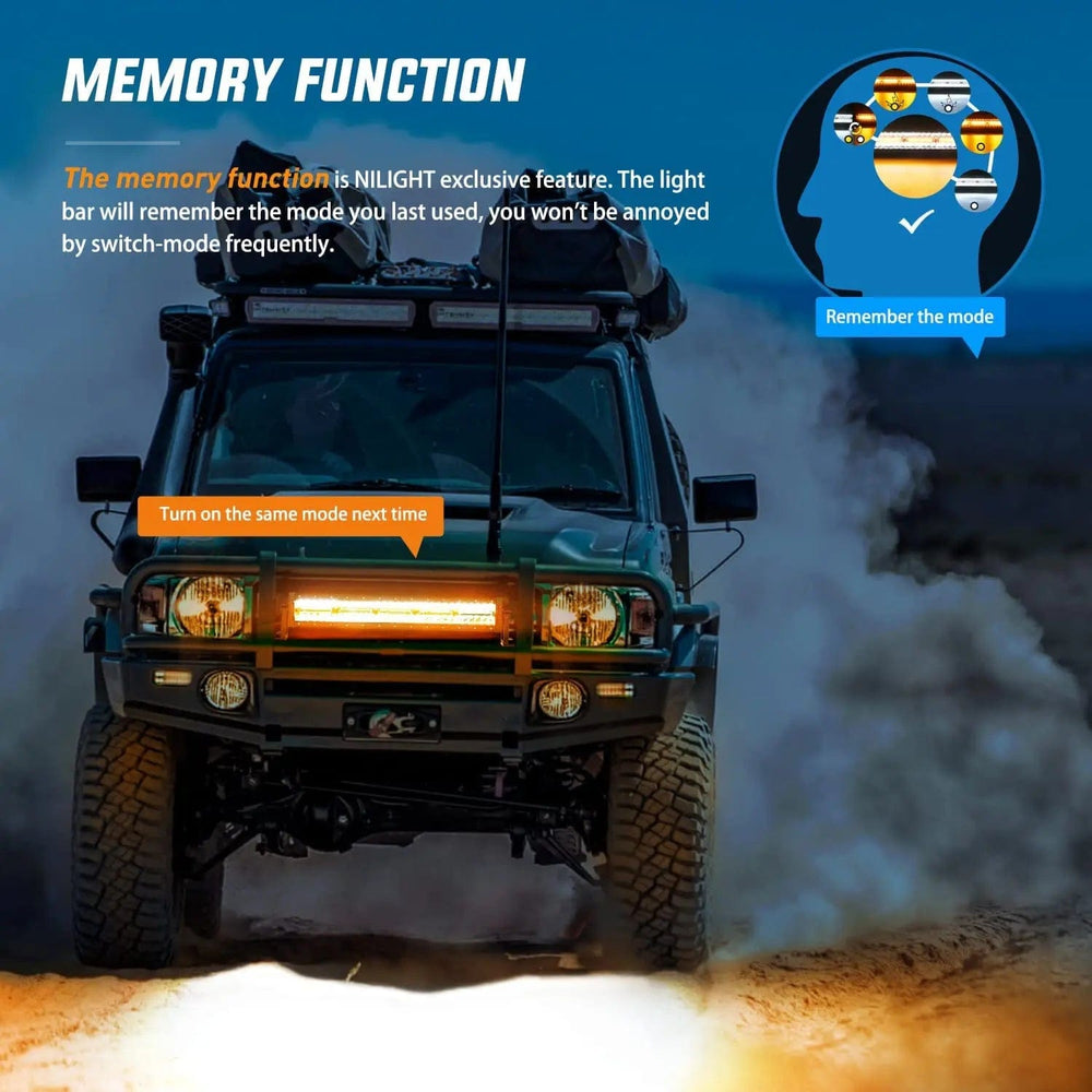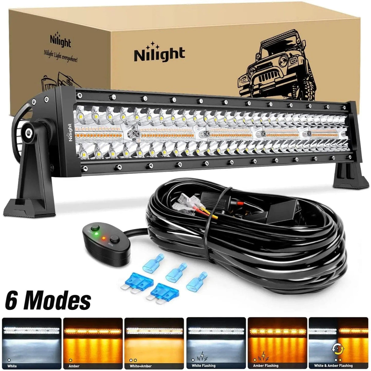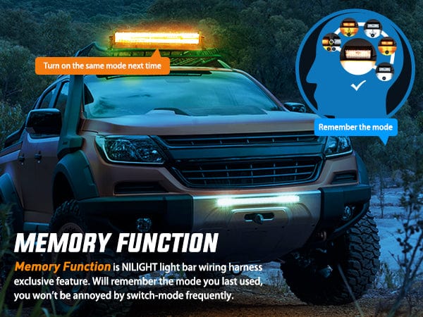 6 Modes with Memory Function: Regulate mode in turn by switch of the lights(white/amber/white & amber/white strobe/amber strobe/ white & amber strobe). The light bar will remember the mode you last used, so you won't be annoyed by switch mode frequently. It's great to use for warning lights, fog lights, driving lights, or work lights. Come with NILIGHT upgraded version wiring harness kit