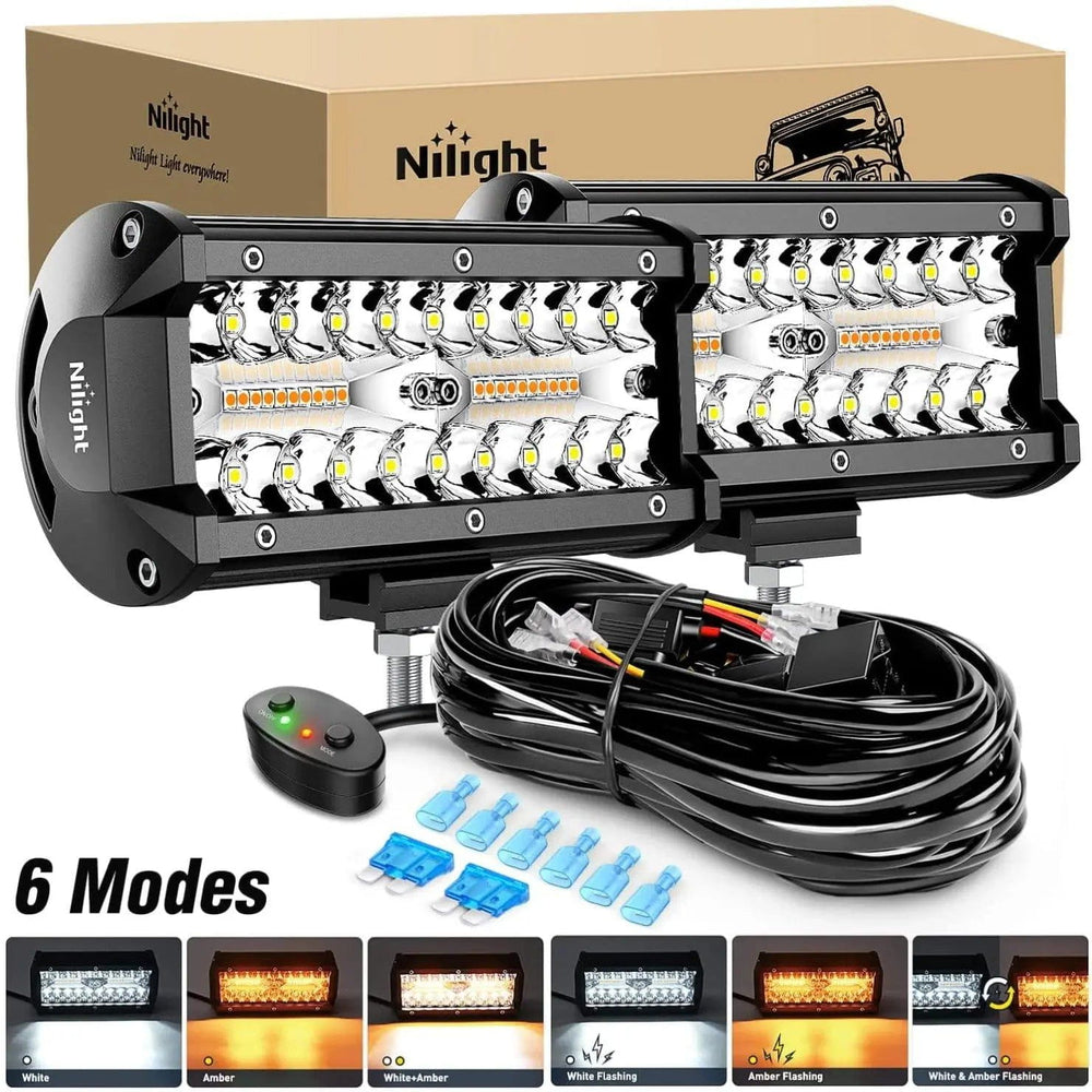 6 Modes with Memory Function: Regulate mode in turn by switch of the lights(white/amber/white & amber/white strobe/amber strobe/ white & amber strobe). The light bar will remember the mode you last used, you won't be annoyed by switch-mode frequently. It's great to use for warning lights, fog lights, driving lights, or work lights. Come with NILIGHT upgraded version wiring harness kit