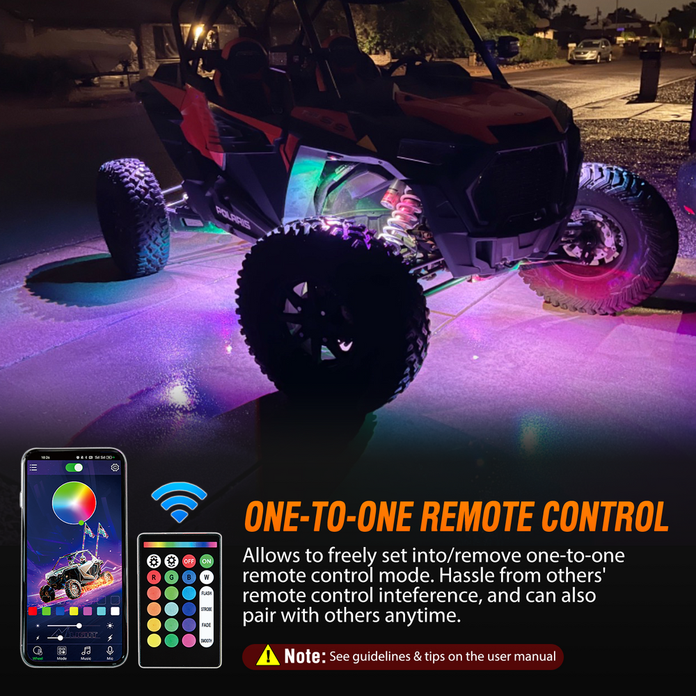 • One-To-One Remote Control: Avoid interference from others' remote controls by setting your rock lights into one-to-one remote control mode. You can also pair with others when you remove the one-to-one remote-control mode. (Note: See guidelines on the user manual)