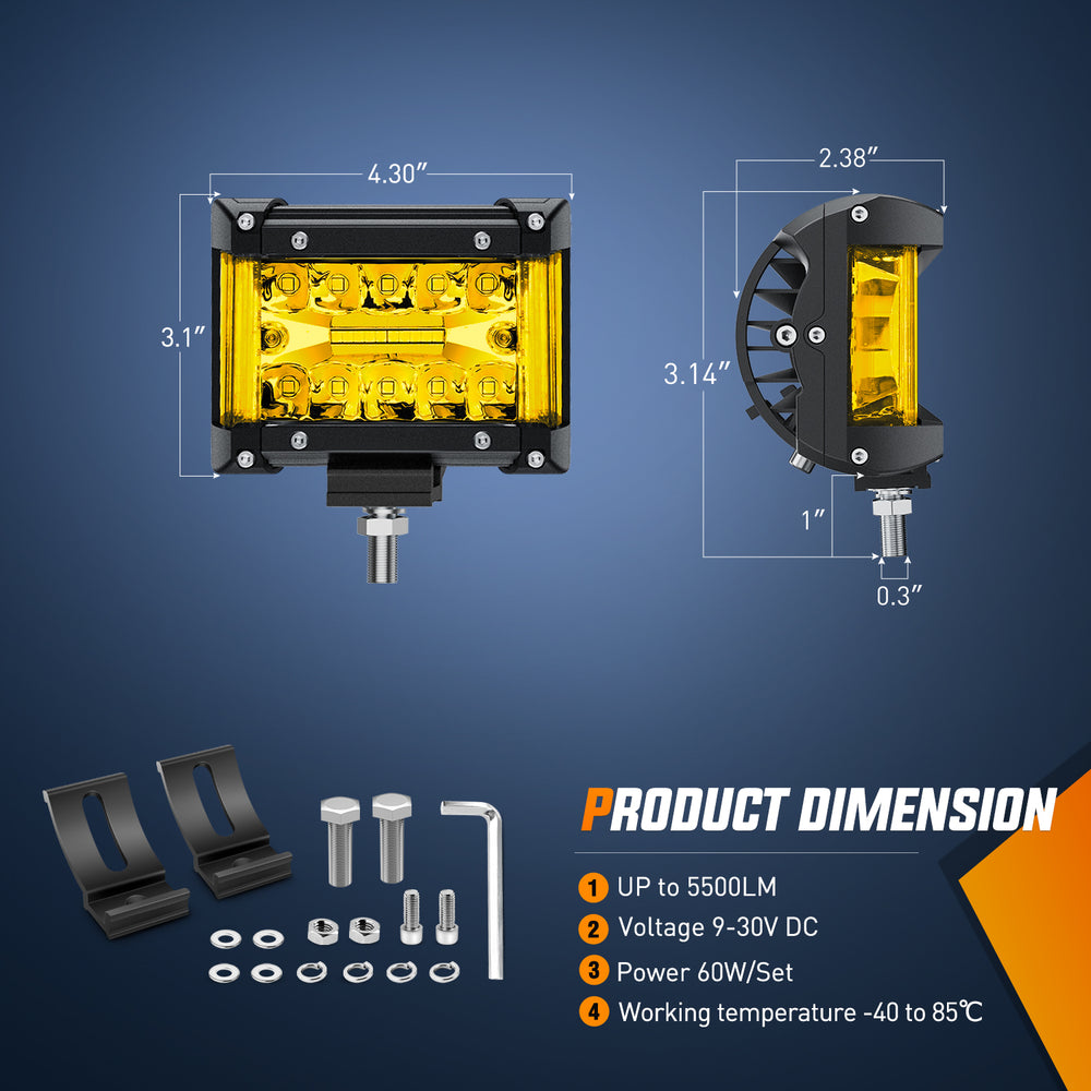 - Package Included: 2 x 4.3inch side shooter LED light bar, 1x 5Pin Rocker Switch 16 AWG wiring harness kit-2 leads and 1 pack of mounting bracket & hardware