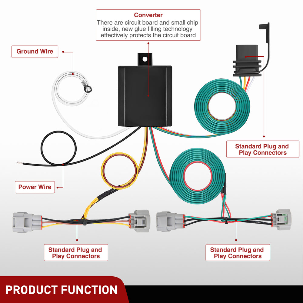 - Easy To Install: No cutting or splicing factory wire. Plug and play harness. This trailer wiring harness kit plugs into existing factory wiring on your vehicle and equips it with a standard, rear 4-pin trailer wiring connector for plugging in and towing a trailer.