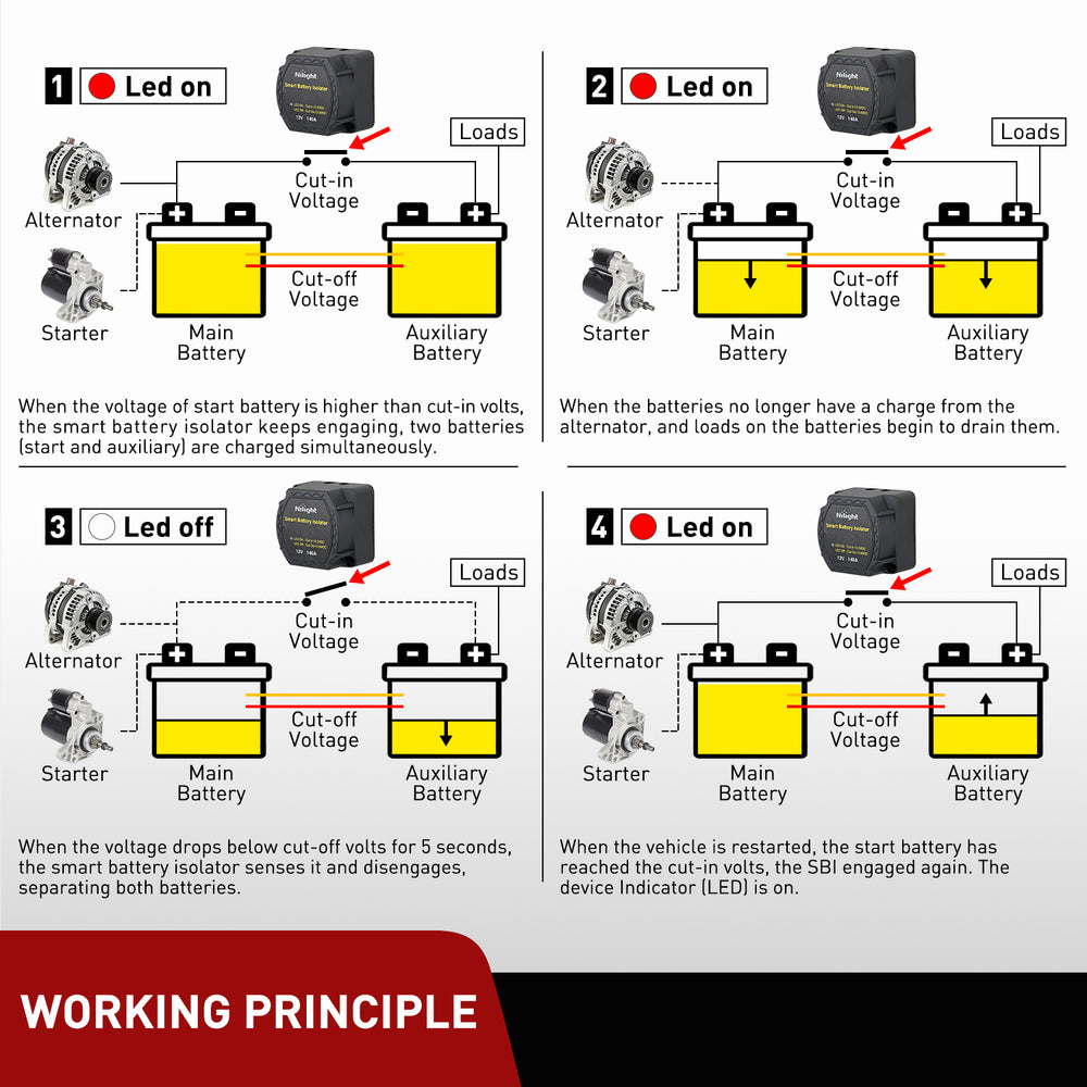 - Wide Application: Like Having Two Separate Power Sources, The Dual Battery Isolator Kit Enables Your Accessories to Run From a Separate Battery While the engine is not running on your vehicle While keeping your Main Battery Charged and Your Vehicle Always Ready to Go and Start When You Want It. Suitable for 12v camper van trucks, caravans, RV, ATV, UTV, Boat and camping applications.