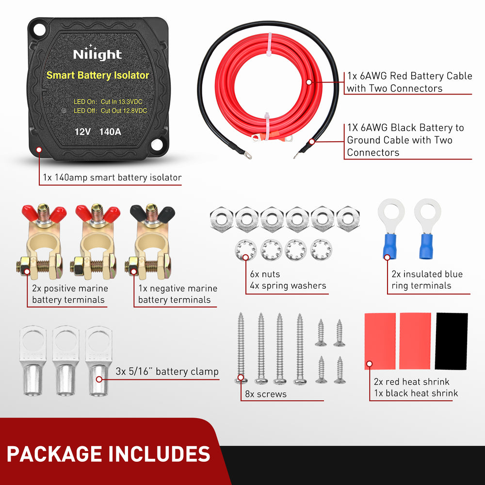 - Package Includes: 1x 140amp smart battery isolator; 1x 6AWG Red Battery Cable with Two Connectors; 1X 6AWG Black Battery to Ground Cable with Two Connectors; 1x negative marine battery terminal; 2x positive marine battery terminals; 3x 5/16inch battery clamp; 8x screws; 6x nuts; 4x spring washers; 2x red heat shrink; 1x black heat shrink; 2x insulated blue ring terminals; 6×cable ties.