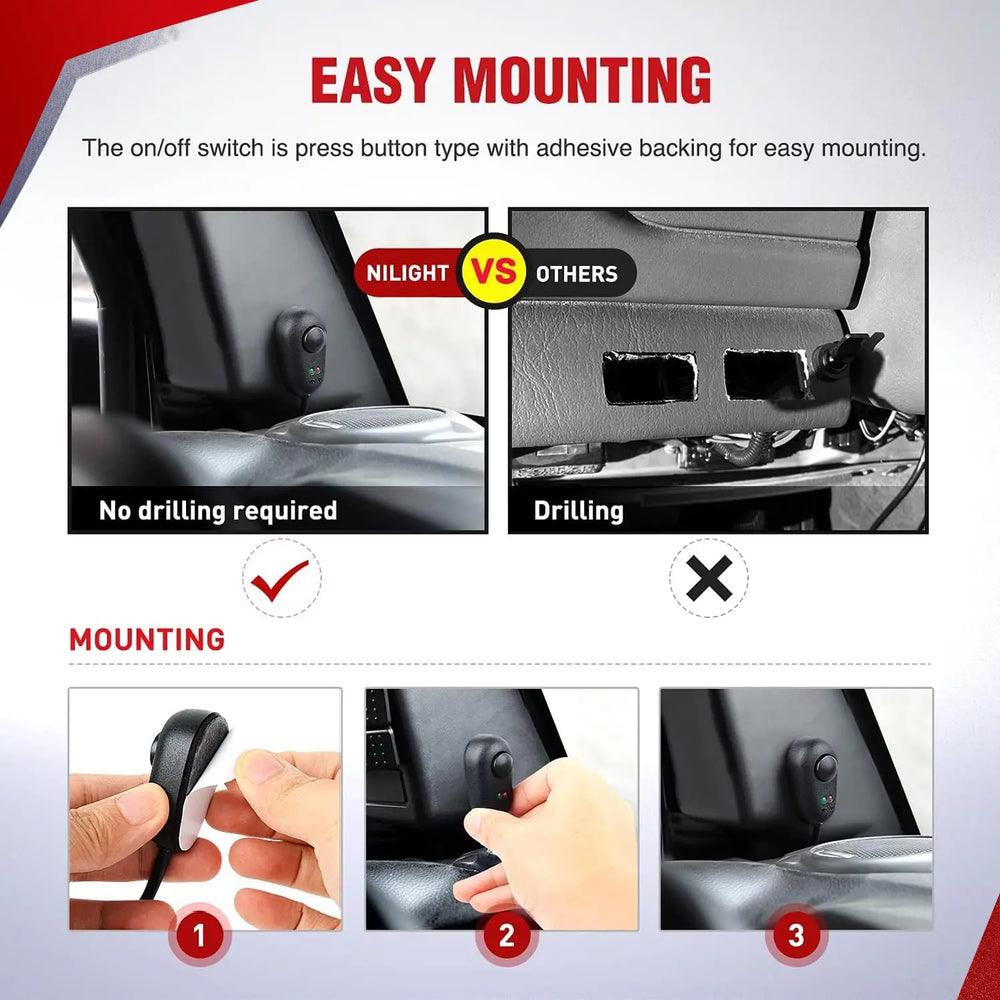 With adhesive backing, no drilling required. You can freely turn on/off the lights with a simple press of the button after the wiring process.